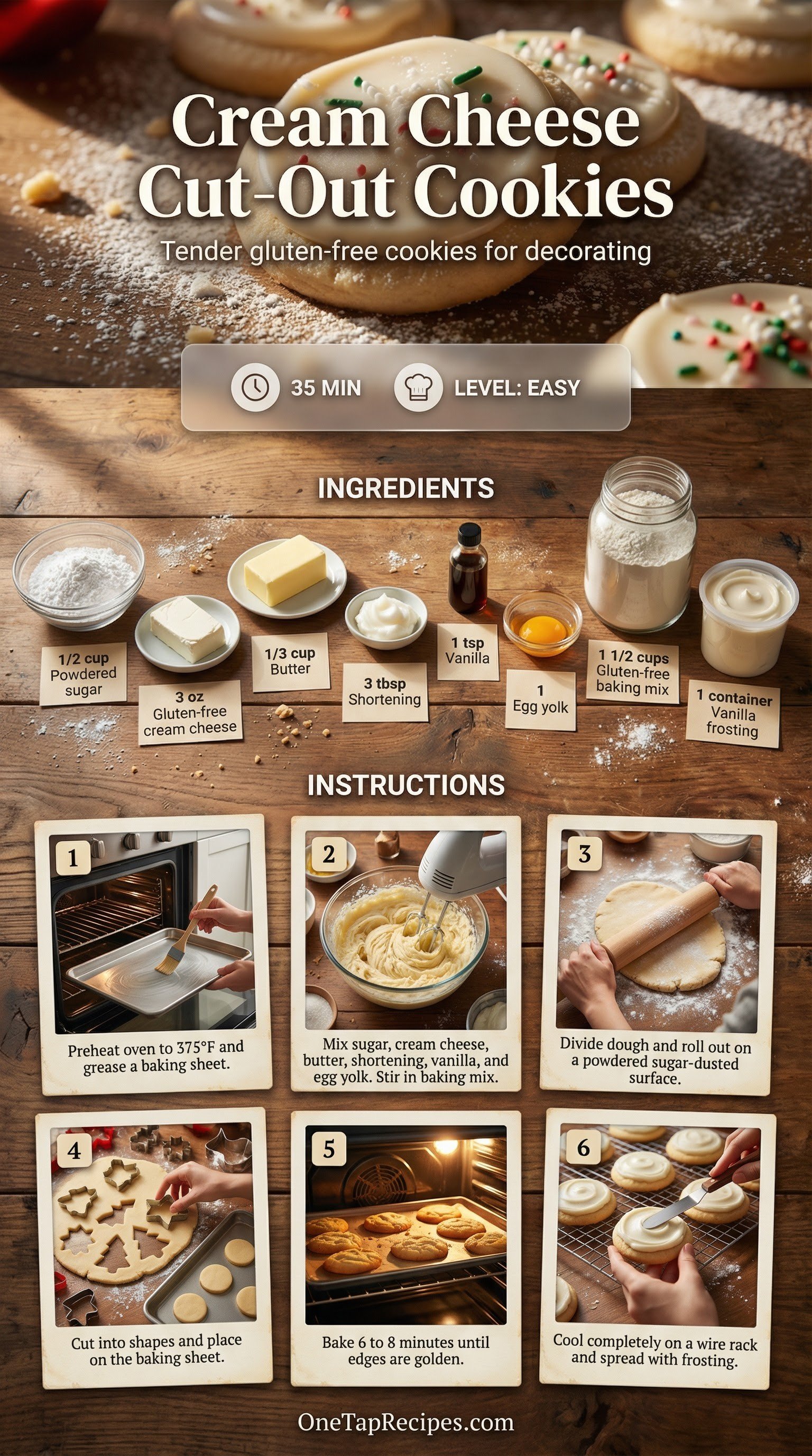 A tender, gluten-free cut-out cookie made with a rich cream cheese dough. The addition of cream cheese and shortening creates a soft, melt-in-your-mouth texture that holds its shape perfectly when baked. These are ideal for holiday decorating, weekend baking projects with kids, or anytime you need a reliable rolled cookie. They bake up with light golden edges and a delicate vanilla flavor that pairs beautifully with your favorite creamy frosting.