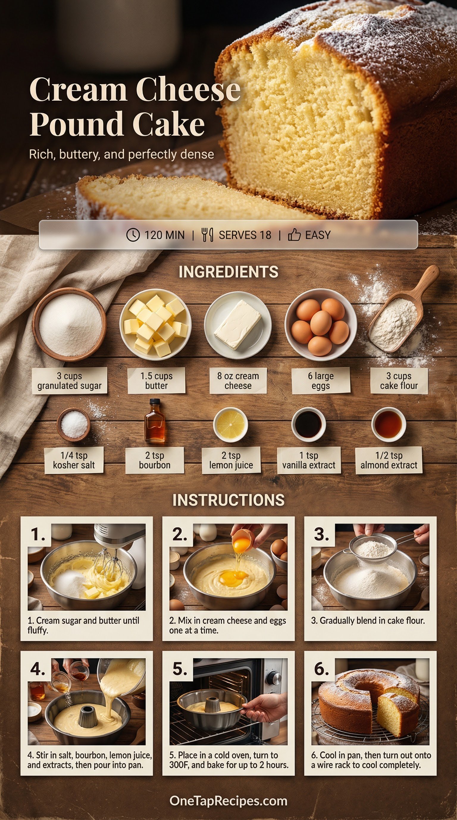 This rich cream cheese pound cake delivers a dense, buttery crumb and a perfectly golden crust. The batter comes together with a blend of vanilla, almond extract, fresh lemon juice, and a splash of bourbon for deep flavor. It uses a cold-oven baking method, starting in an unpreheated oven to ensure an even rise and a tender texture. Serve this classic dessert at your next gathering or enjoy a thick slice with your afternoon coffee.