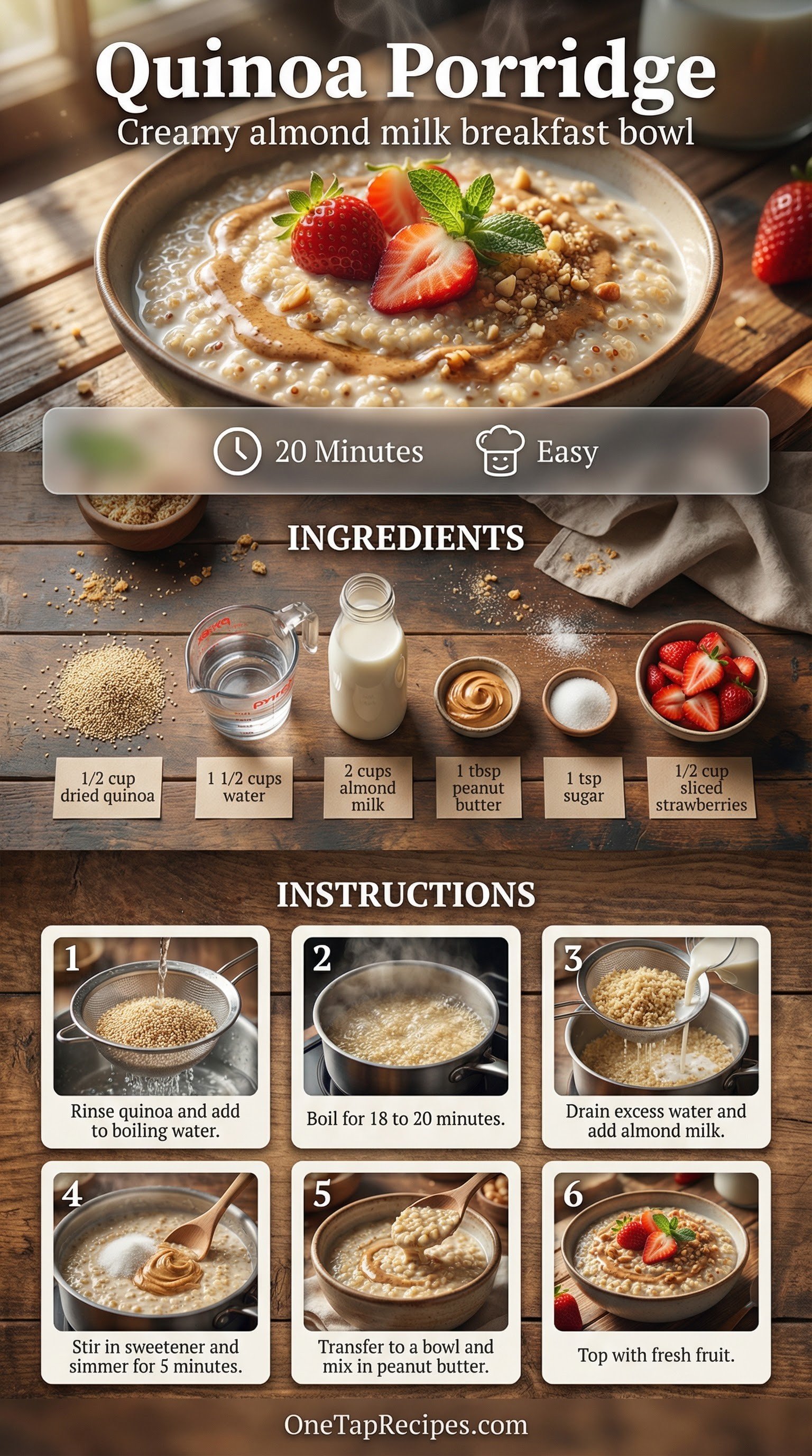 Warm, nutty, and incredibly creamy, this protein-packed quinoa porridge is a fantastic alternative to your standard morning oatmeal. Simmering the cooked grains in almond milk creates a rich base that absorbs flavors beautifully. A swirl of peanut butter adds a savory depth that balances the natural sweetness of fresh strawberries. You'll love how easily it adapts to whatever fruit or nuts you have on hand.