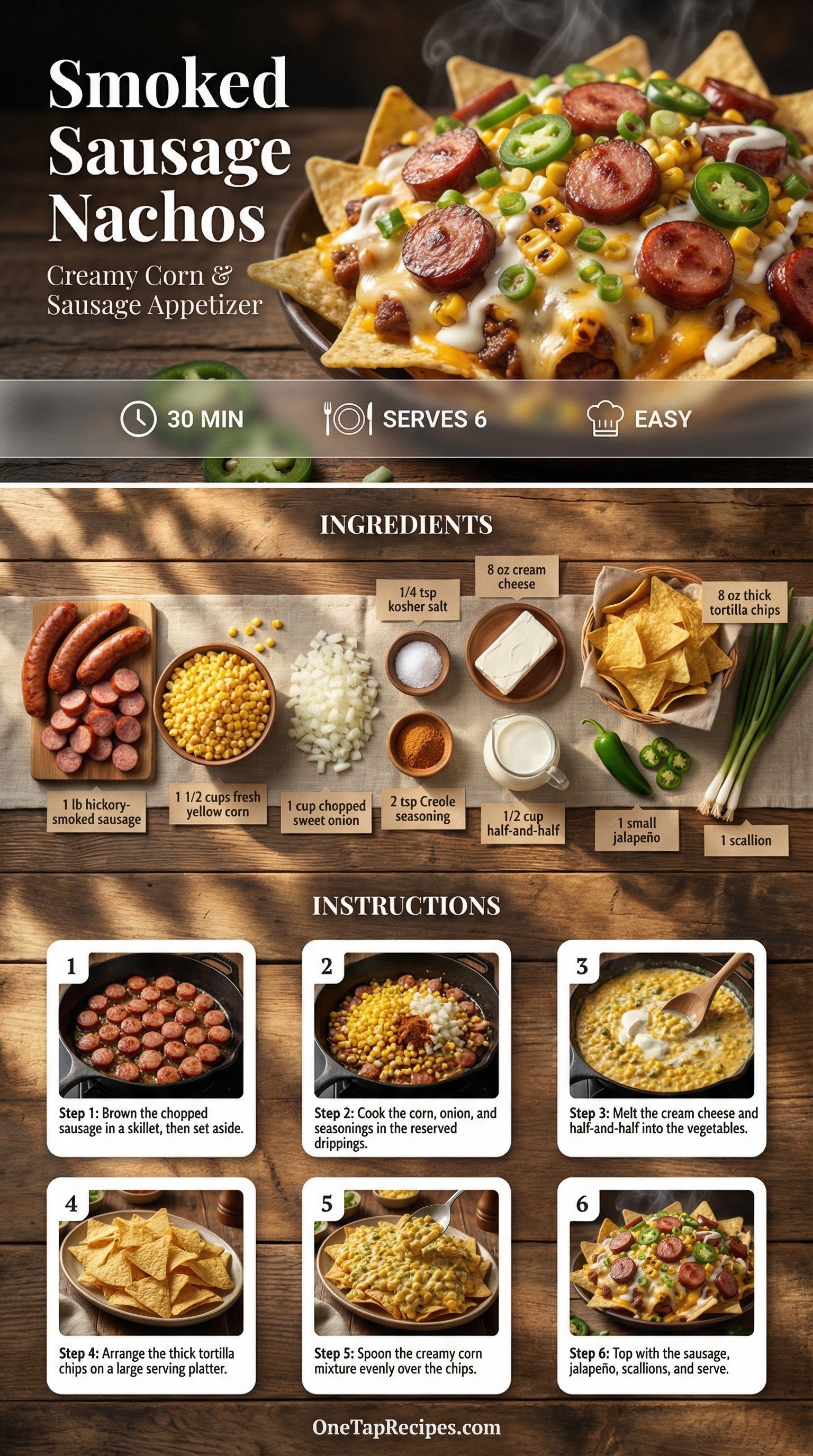 Sweet corn, still warm from the skillet, meets savory smoked sausage in this rich take on loaded nachos. Instead of standard melted cheese, you'll build a creamy sauce right in the pan drippings using cream cheese and half-and-half. It's a deeply flavorful topping that coats thick tortilla chips beautifully. Fresh jalapeño and scallions cut through the richness, making it an appetizer you won't want to stop eating.