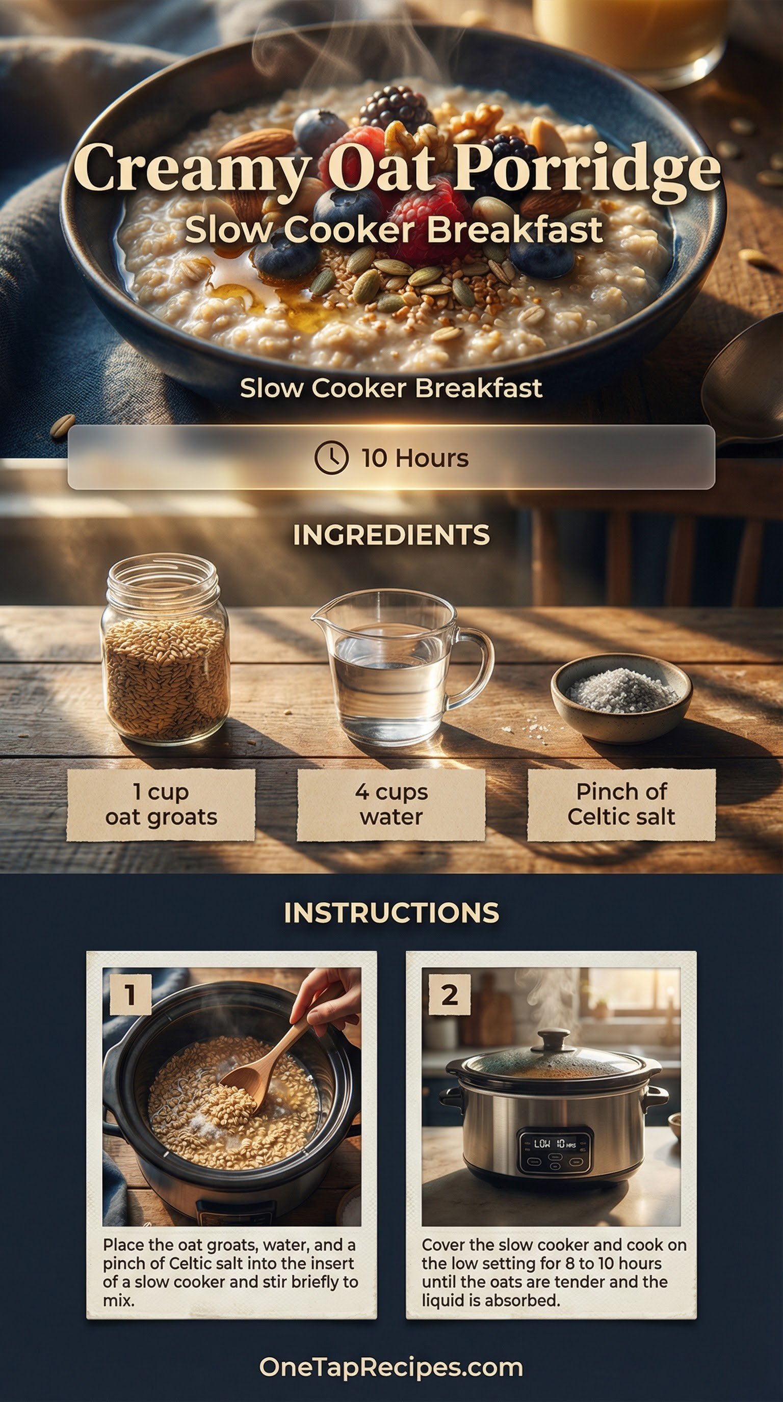 Start your morning with a warm bowl of creamy oat porridge. Using whole oat groats creates a deeply satisfying texture that holds its shape while releasing a rich starchiness. The slow cooker does all the heavy lifting overnight. You simply combine the ingredients before bed and wake up to a ready-to-eat breakfast. It is a comforting and hands-off way to feed the family on busy weekday mornings. Top each bowl with your favorite fresh fruit or a drizzle of honey for a perfect start to the day.