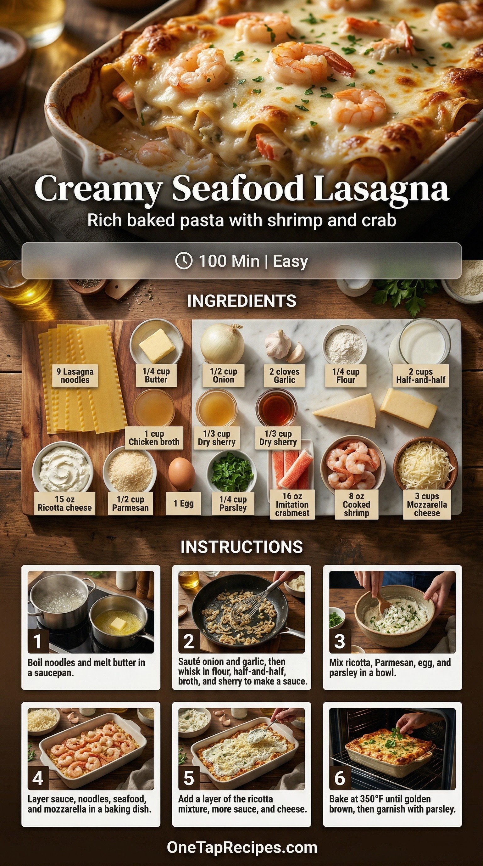 This rich baked pasta layers tender noodles with a creamy white sauce, sweet imitation crab, and shrimp. A homemade sherry-infused cream sauce brings everything together alongside a blend of ricotta, mozzarella, and parmesan cheeses. It is a perfect choice for a cozy weekend dinner or preparing ahead as a freezer-friendly meal. The combination of sweet seafood and savory garlic cream creates a deeply satisfying bite.