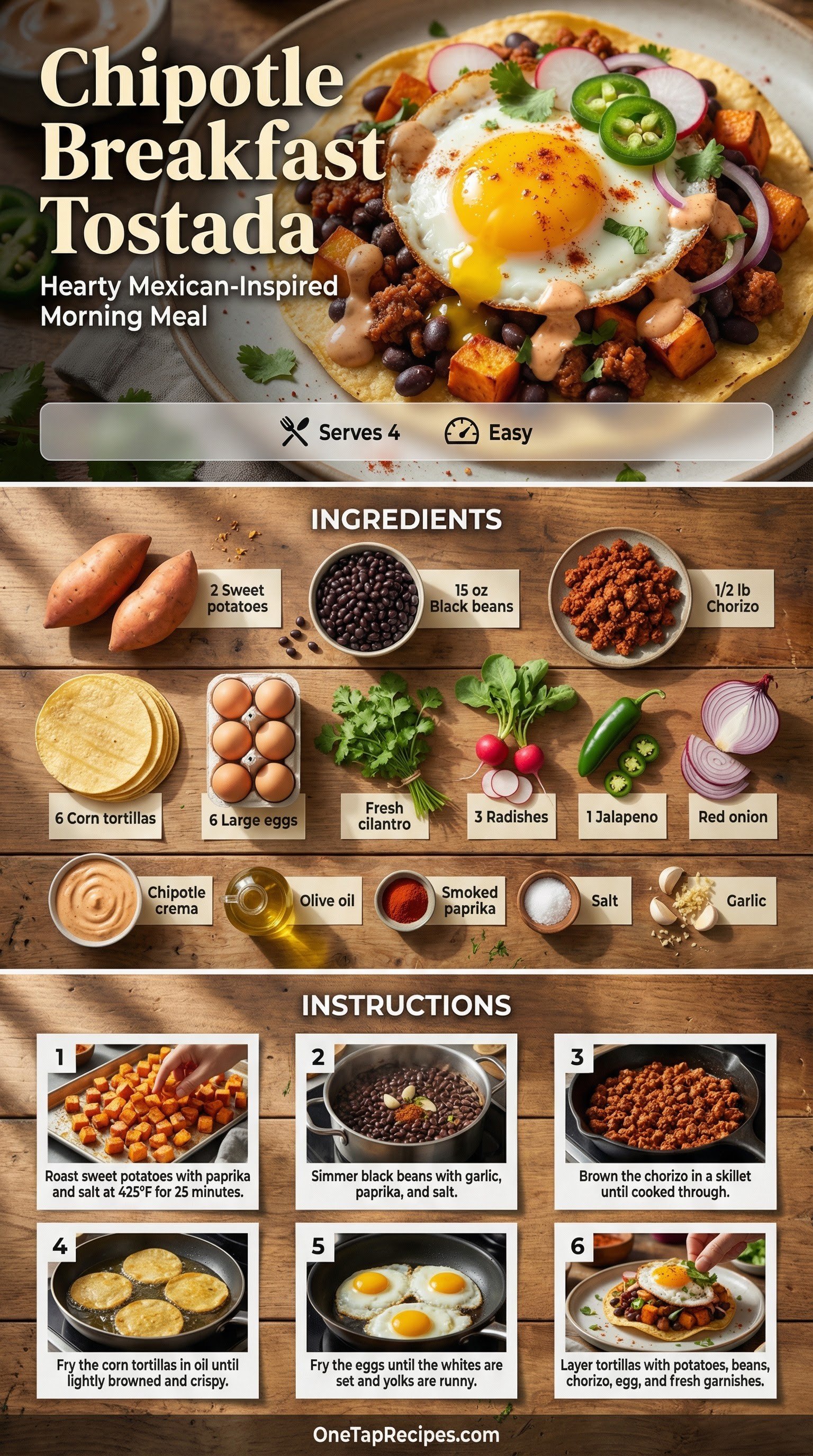 7. 7Assemble the tostadas by layering the crispy tortillas with the roasted sweet potatoes, warm black beans, cooked chorizo, and a fried egg. Garnish with fresh cilantro, sliced radishes, jalapeno, and red onion, then finish with a drizzle of chipotle crema.