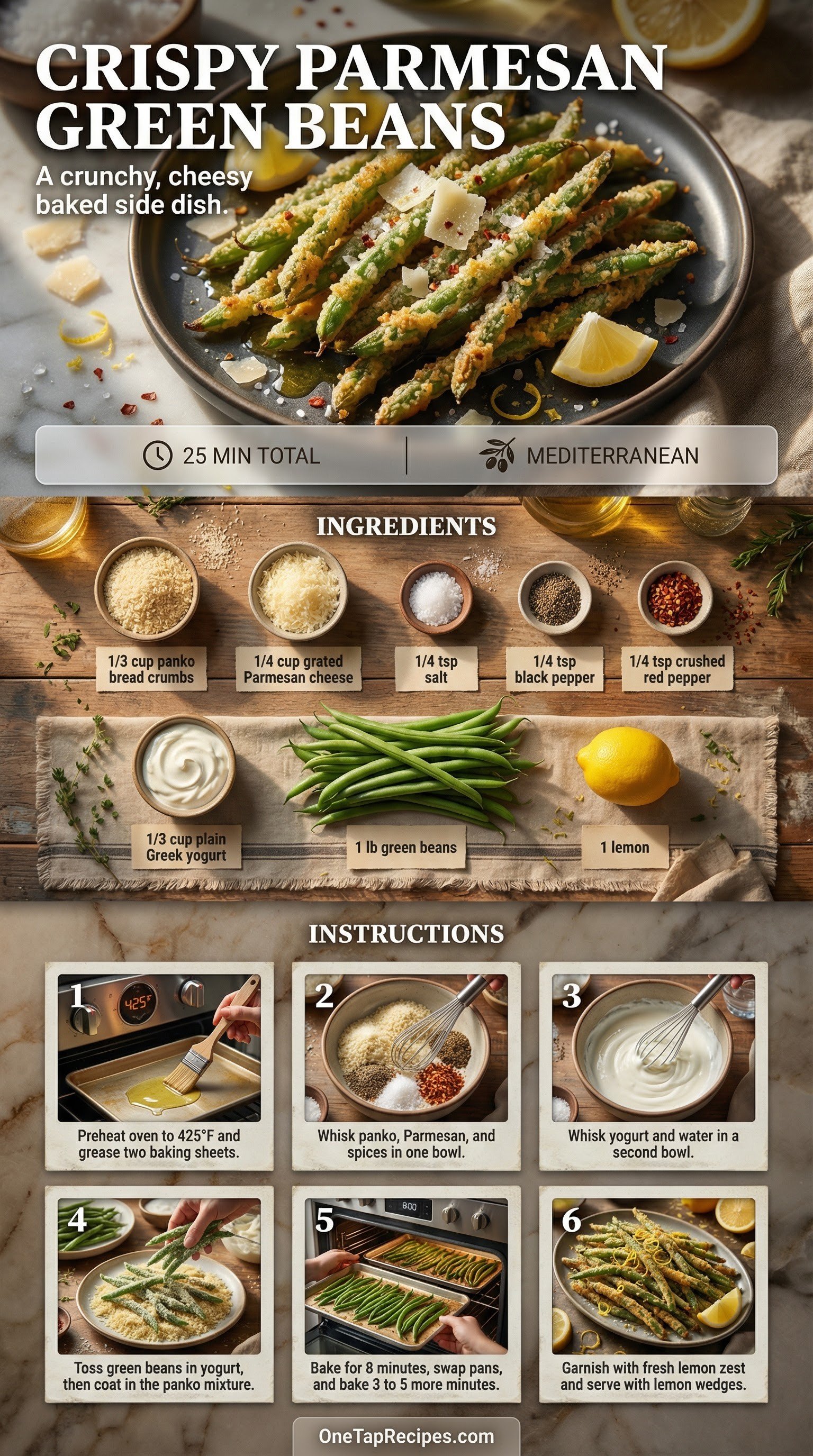 These crispy baked green beans are coated in a savory blend of Parmesan cheese and panko breadcrumbs. Instead of a traditional egg wash, plain Greek yogurt acts as the perfect tangy binder to help the crispy coating stick to every vegetable. They make an excellent quick side dish for weeknight dinners or a crunchy snack straight from the baking sheet. A final shower of fresh lemon zest brightens the rich, cheesy crust for a perfectly balanced bite.