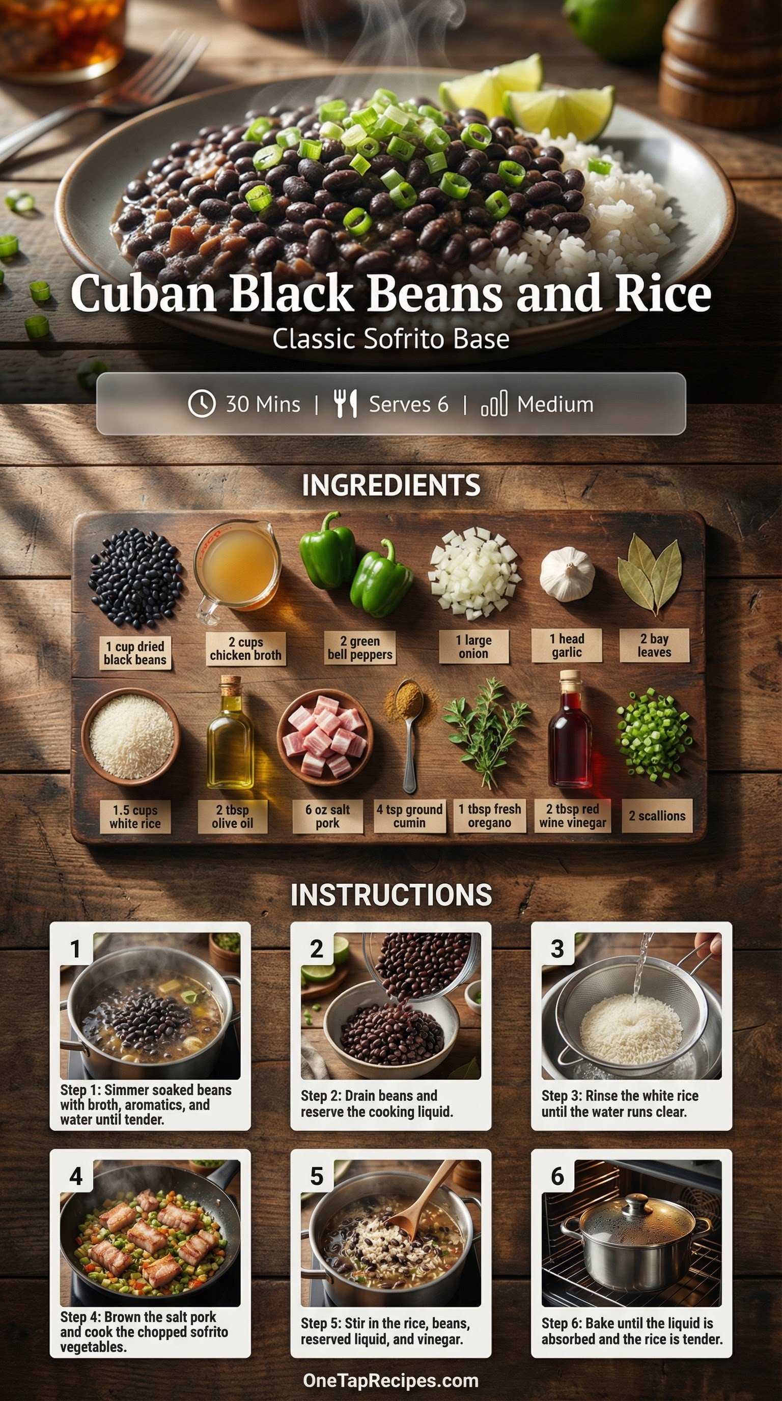 Cuban black beans and rice is a deeply comforting dish built on a foundation of rich, savory flavors. The process begins by simmering dried black beans until just tender, creating a flavorful cooking liquid. A traditional sofrito of green bell peppers, onions, and garlic is cooked down with rendered salt pork, cumin, and fresh oregano to build a robust aromatic base. Long-grain white rice and the cooked beans are then combined with the sofrito and baked until perfectly fluffy. A splash of red wine vinegar adds a bright finish to balance the richness. Serve it as a hearty side or a satisfying main course topped with fresh scallions.
