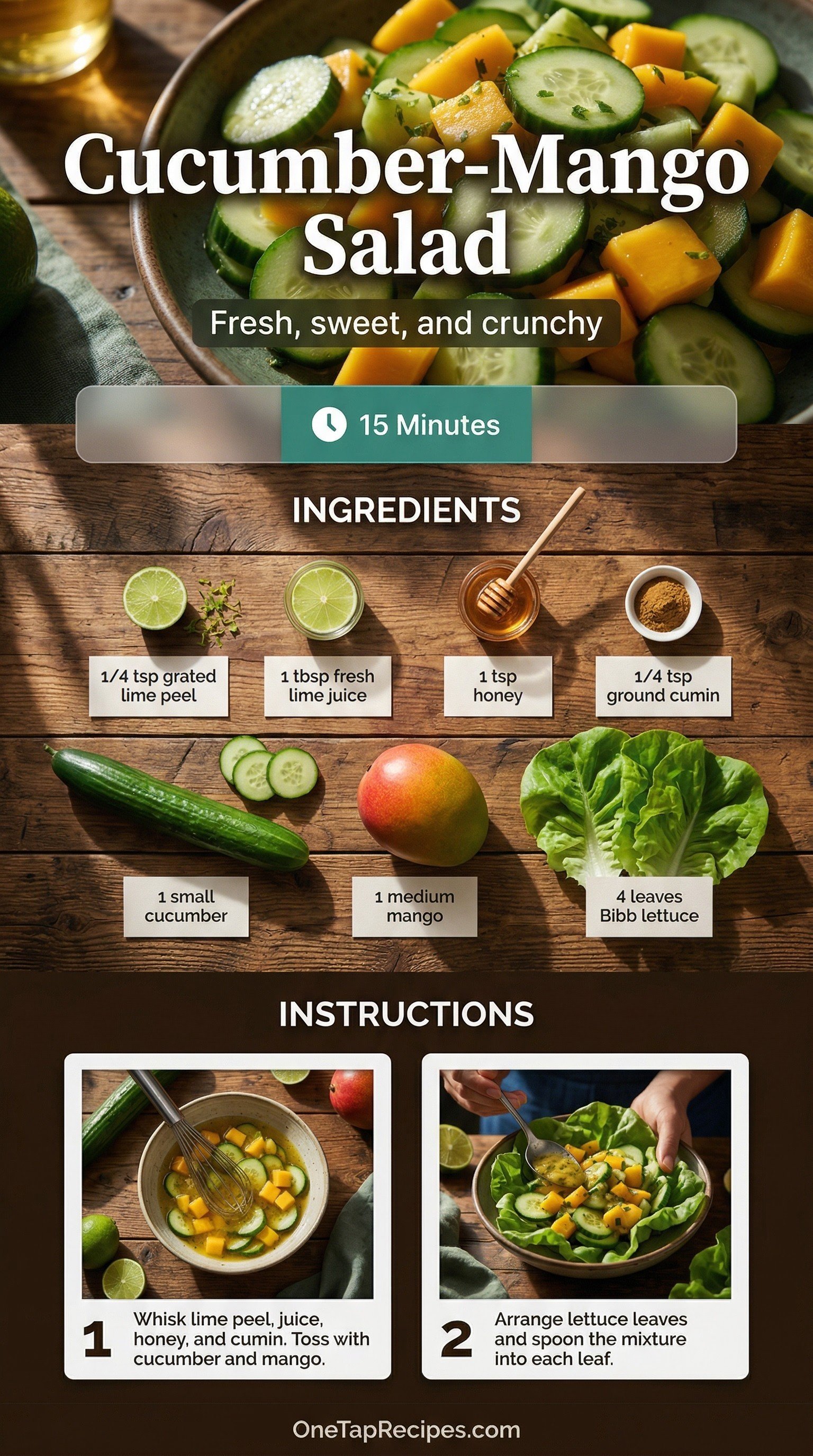 1. 1Whisk the grated lime peel, fresh lime juice, honey, and ground cumin together in a small bowl. Add the chopped cucumber and cubed mango, tossing gently to coat everything in the dressing without mashing the soft fruit.