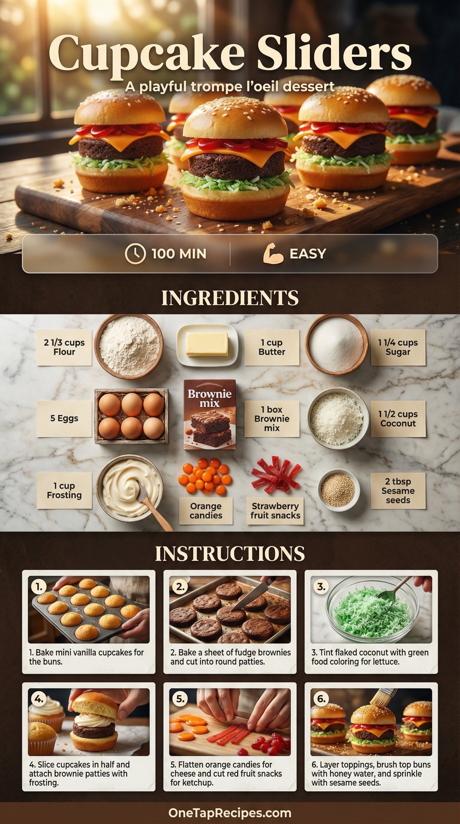 Cupcake sliders are a playful, sweet dessert that looks exactly like miniature hamburgers. They use vanilla cupcakes for the buns, rich fudge brownies for the burger patties, and clever candy additions for the cheese and ketchup. These bite-sized treats are perfect for kids' birthday parties, summer barbecues, or any fun gathering where you want a surprising dessert. The combination of tender cake, dense chocolate brownie, and chewy fruit candies creates a delightful mix of textures and sweet flavors in every bite.