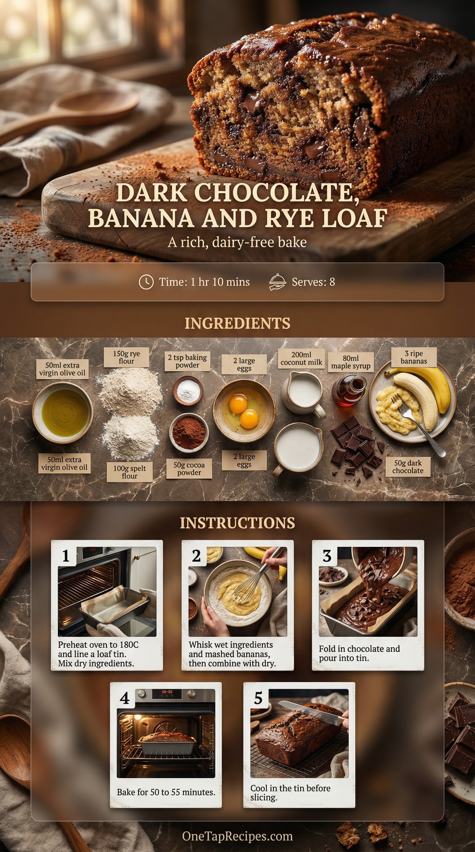 This dark chocolate, banana and rye loaf is a rich, satisfying baked treat. It uses wholesome rye and spelt flours instead of standard white flour, naturally sweetened with maple syrup and ripe bananas. Coconut milk and olive oil keep the crumb incredibly moist without relying on dairy. The deep cocoa flavor and chunks of dark chocolate make it a perfect afternoon snack or a quick breakfast on the go.