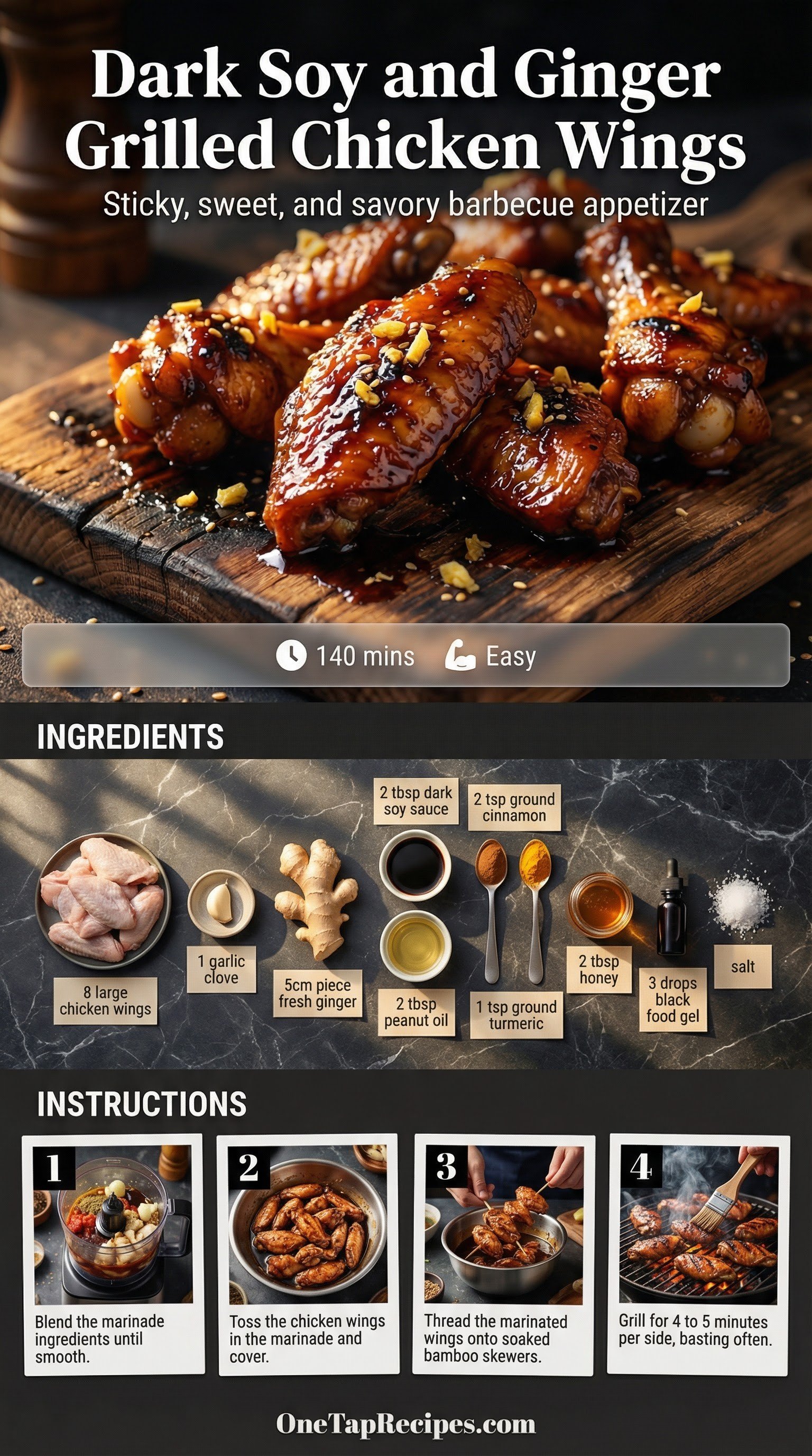 These grilled chicken wings are marinated in a rich blend of dark soy sauce, fresh ginger, and honey. A touch of black food gel gives the marinade a deep, dramatic color that is perfect for a themed party or Halloween gathering. You can easily skip the food coloring for a classic, appetizing look. Warm spices like cinnamon and turmeric add an unexpected, savory depth to the sticky, sweet glaze.