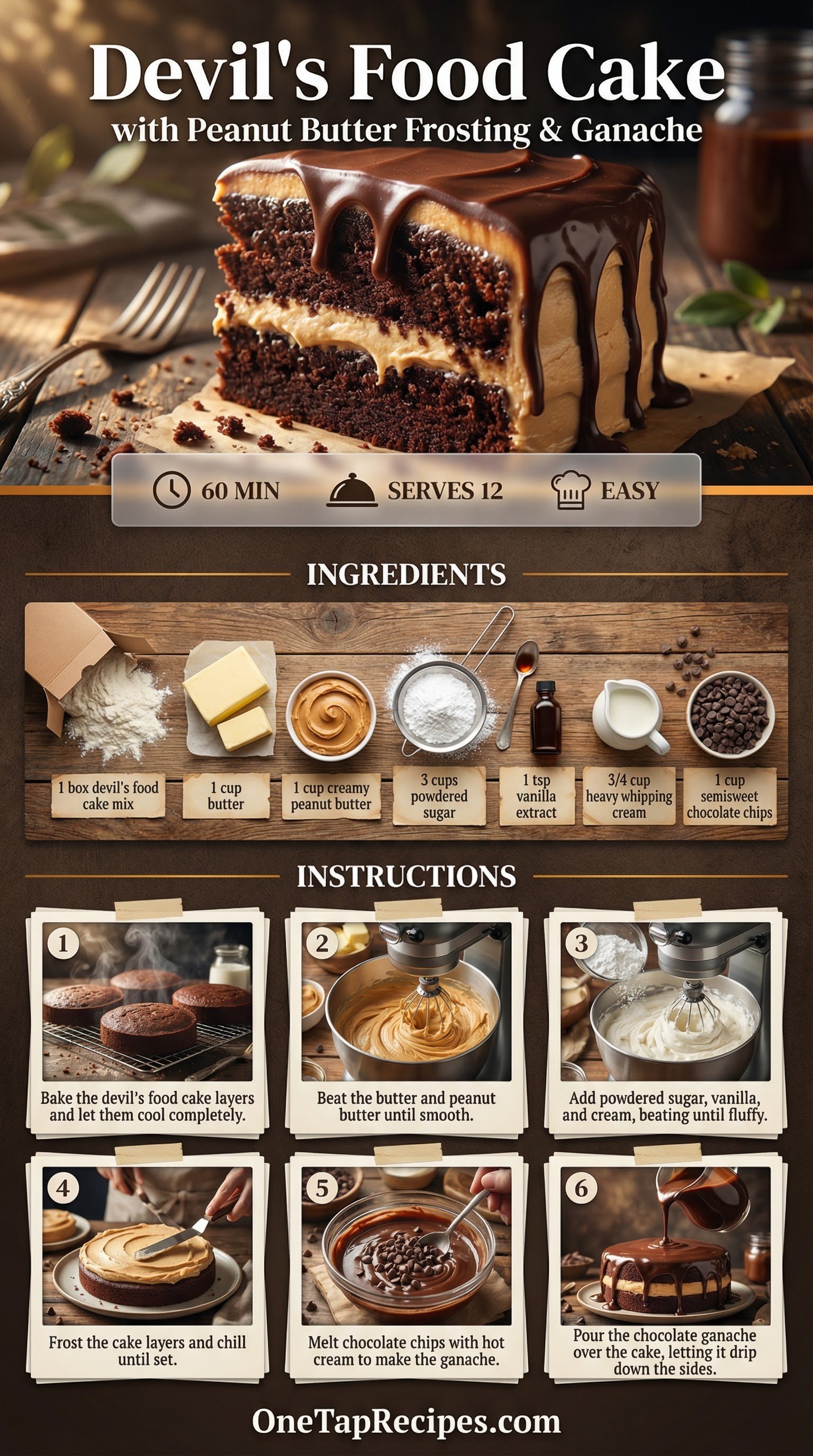 A rich chocolate layer cake gets a major upgrade with a salty-sweet peanut butter frosting. Using a boxed cake mix keeps the preparation simple while delivering a reliable, tender crumb. The homemade frosting whips up smooth and fluffy, making it easy to spread over the baked layers. A glossy chocolate ganache drips down the sides for a rich finish. Serve this impressive dessert at your next birthday party or weekend gathering.
