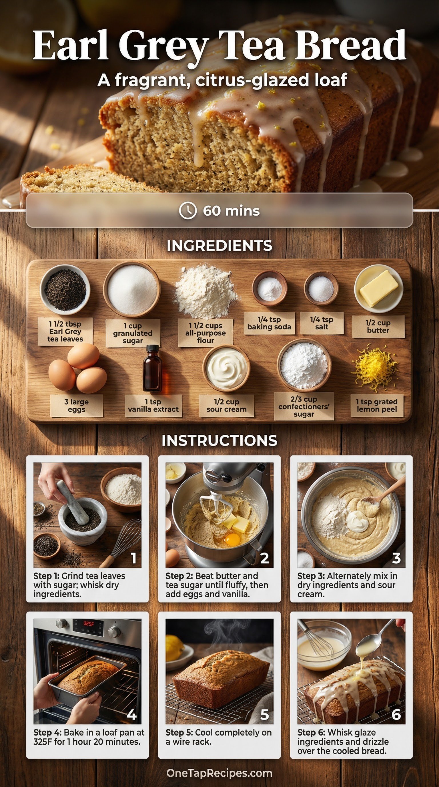 Earl Grey tea bread is a tender, fragrant loaf cake infused with the distinct citrus and floral notes of real tea leaves. Grinding the loose tea directly into the sugar releases its essential oils, creating a deeply aromatic base for the batter. Sour cream keeps the crumb incredibly moist and rich. A simple, zesty lemon glaze finishes the loaf, perfectly complementing the bergamot flavor of the tea. Serve a thick slice alongside your afternoon cup or enjoy it as a sophisticated brunch treat.