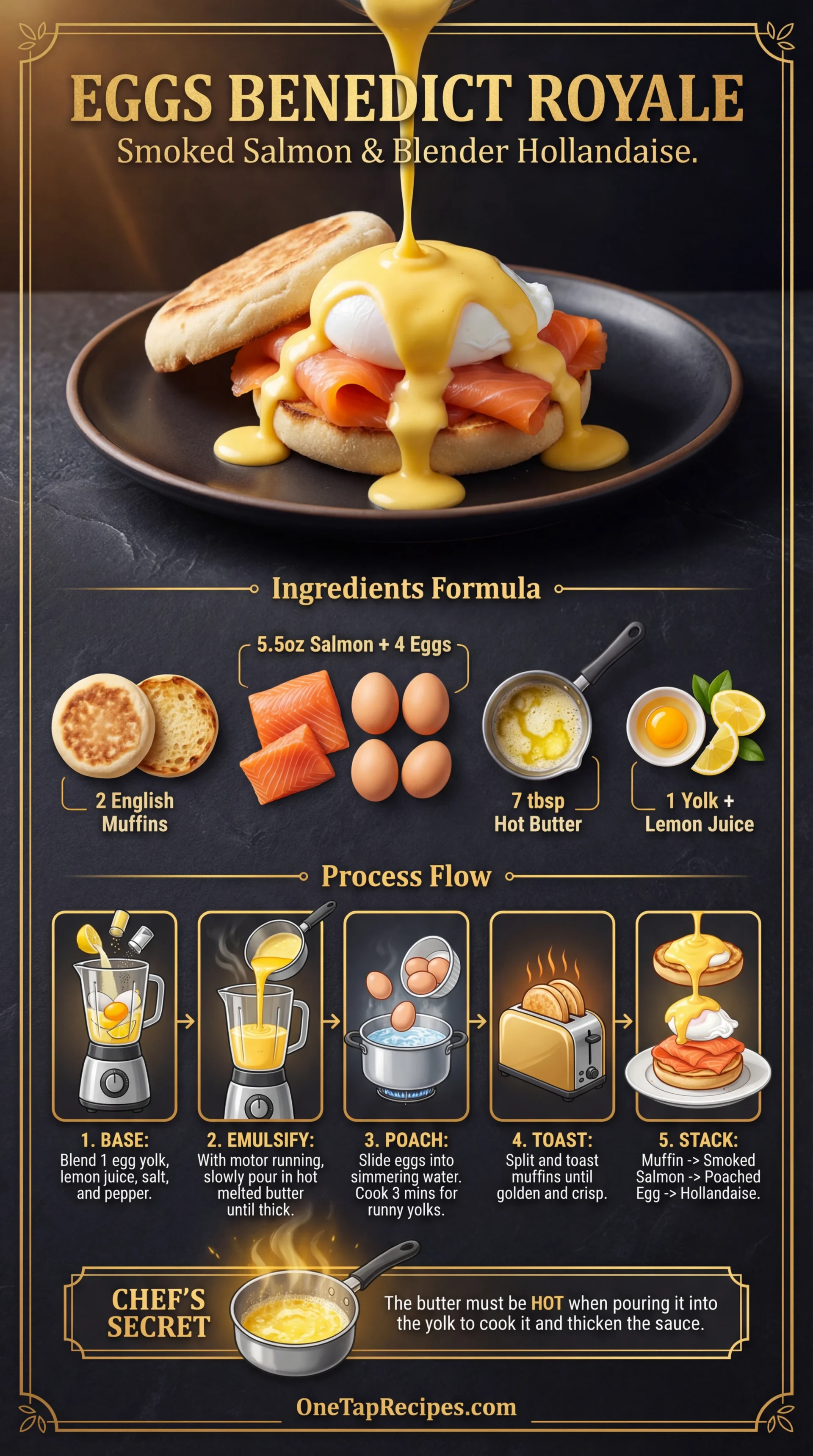 - Assemble: Top each muffin half with smoked salmon, a poached egg, and a generous pour of Hollandaise.