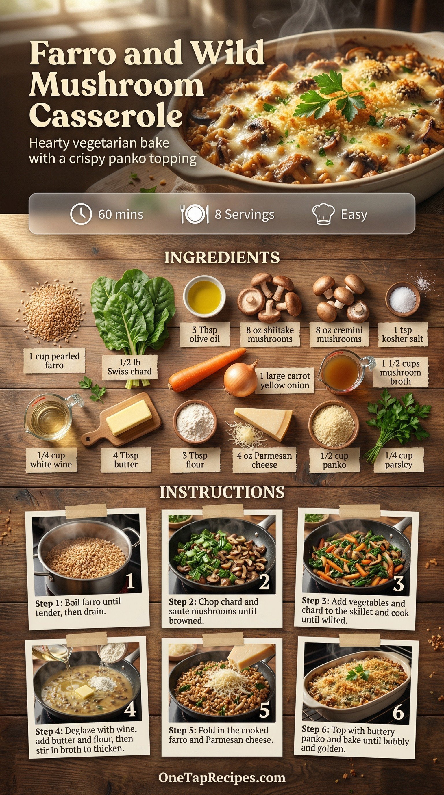 This hearty vegetarian casserole brings together nutty farro and an earthy mix of shiitake and cremini mushrooms. Fresh Swiss chard adds a bright pop of green and a mild bitterness that balances the rich, savory mushroom broth. A splash of dry white wine deglazes the pan to build deep flavor before everything gets folded with grated Parmesan cheese. A crispy, buttery panko topping finishes the dish with a satisfying crunch. Serve this comforting bake as a satisfying weeknight dinner or a robust holiday side dish.