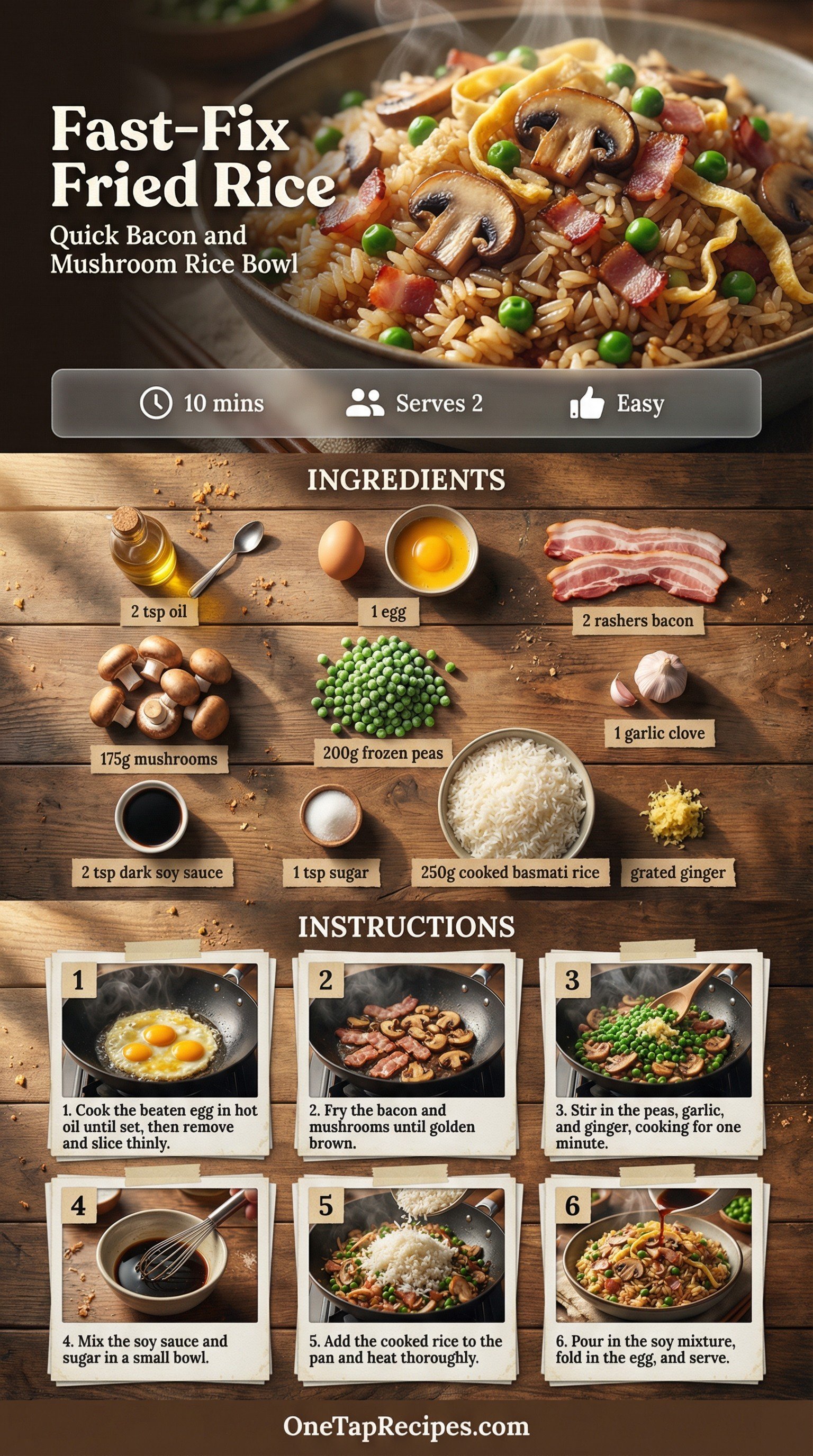 Quick fried rice turns simple ingredients into a satisfying meal in minutes. Bacon and mushrooms bring deep savory notes, while sweet peas and fresh ginger add brightness to the bowl. Using leftover or pouch basmati rice keeps the process fast and straightforward. It is a perfect weeknight dinner when you need something comforting but short on time. A quick splash of sweetened dark soy sauce ties everything together with a rich, glossy finish.