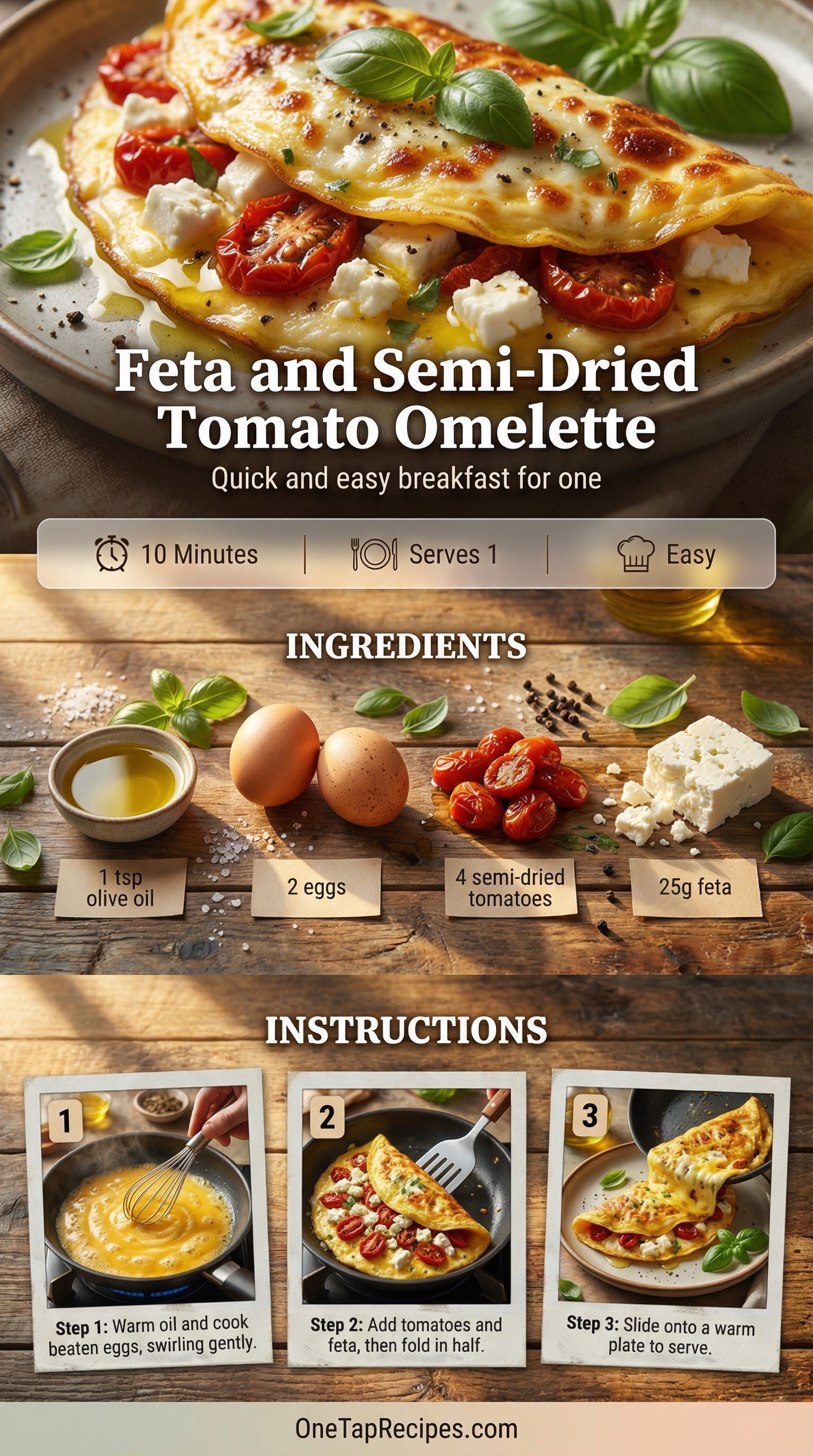 This quick feta and semi-dried tomato omelette makes a perfect single-serving meal. The salty bite of crumbled feta pairs beautifully with the sweet, concentrated flavor of semi-dried tomatoes. It comes together in minutes for a fast weekday breakfast or a simple solo dinner. The eggs stay tender and slightly runny in the center, creating a rich and satisfying texture.