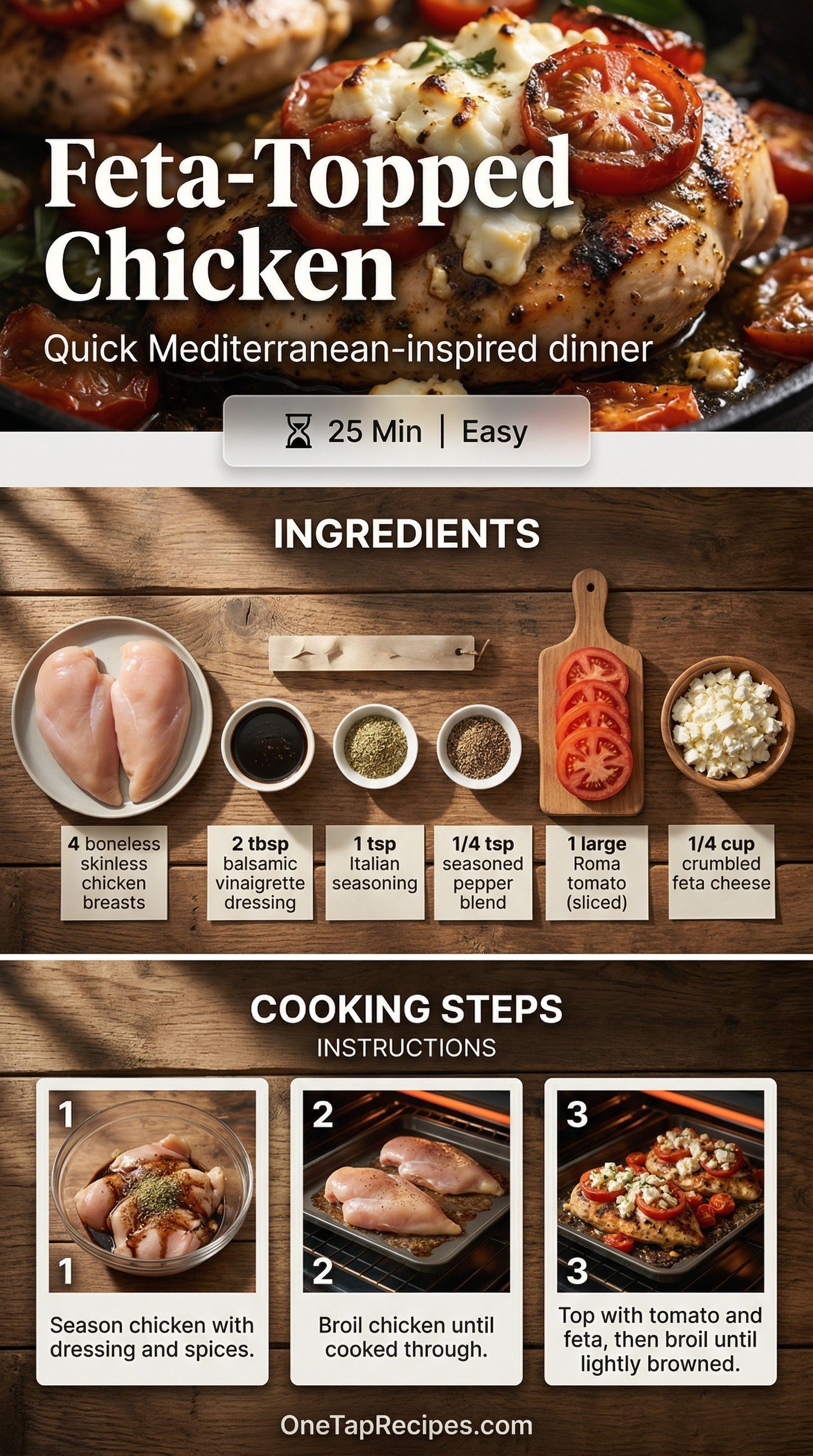 Feta-Topped Chicken is a quick and flavorful weeknight dinner that comes together in minutes under the broiler. Boneless, skinless chicken breasts are brushed with tangy balsamic vinaigrette and dusted with Italian herbs before cooking to juicy perfection. Fresh slices of Roma tomato and crumbled feta cheese are added at the very end, melting slightly under the heat. The result is a bright, savory main course with a Mediterranean twist. Serve it alongside a crisp green salad or roasted vegetables for a complete meal.