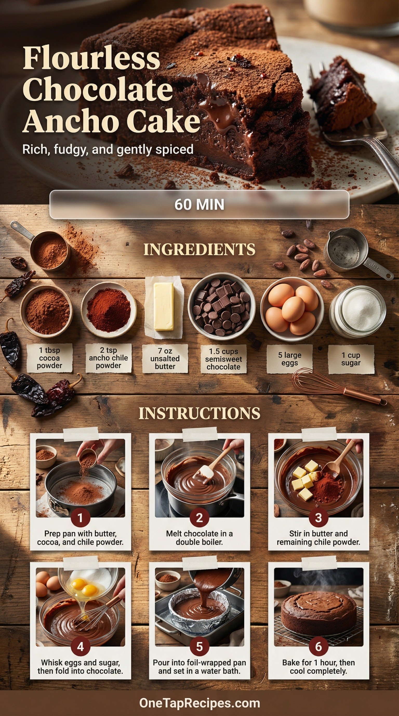 This rich, flourless chocolate cake is infused with the subtle, earthy heat of ancho chile powder. Baking the batter in a water bath creates an incredibly dense, fudgy texture that melts in the mouth. The gentle warming spice of the chile cuts through the sweetness of the semisweet chocolate, adding sophisticated depth to every bite. It makes an elegant dessert for dinner parties or holiday gatherings. Serve it chilled or at room temperature, perhaps with a handful of fresh berries to brighten the plate.
