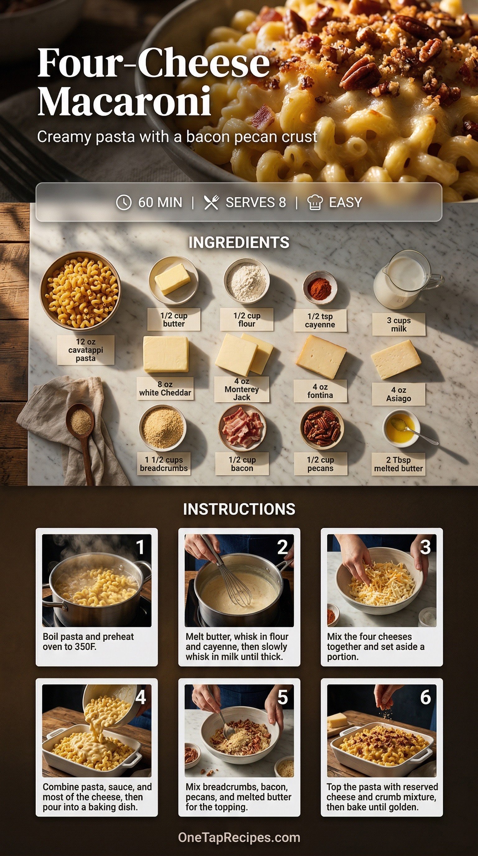 This baked macaroni and cheese combines four distinct cheeses with a crispy bacon and pecan topping. White Cheddar, Monterey Jack, fontina, and Asiago melt together to create a rich, savory sauce that coats every piece of pasta. A buttery breadcrumb mixture adds the perfect crunch to contrast the creamy interior. It is a comforting casserole that works beautifully as a main course or a decadent holiday side dish.