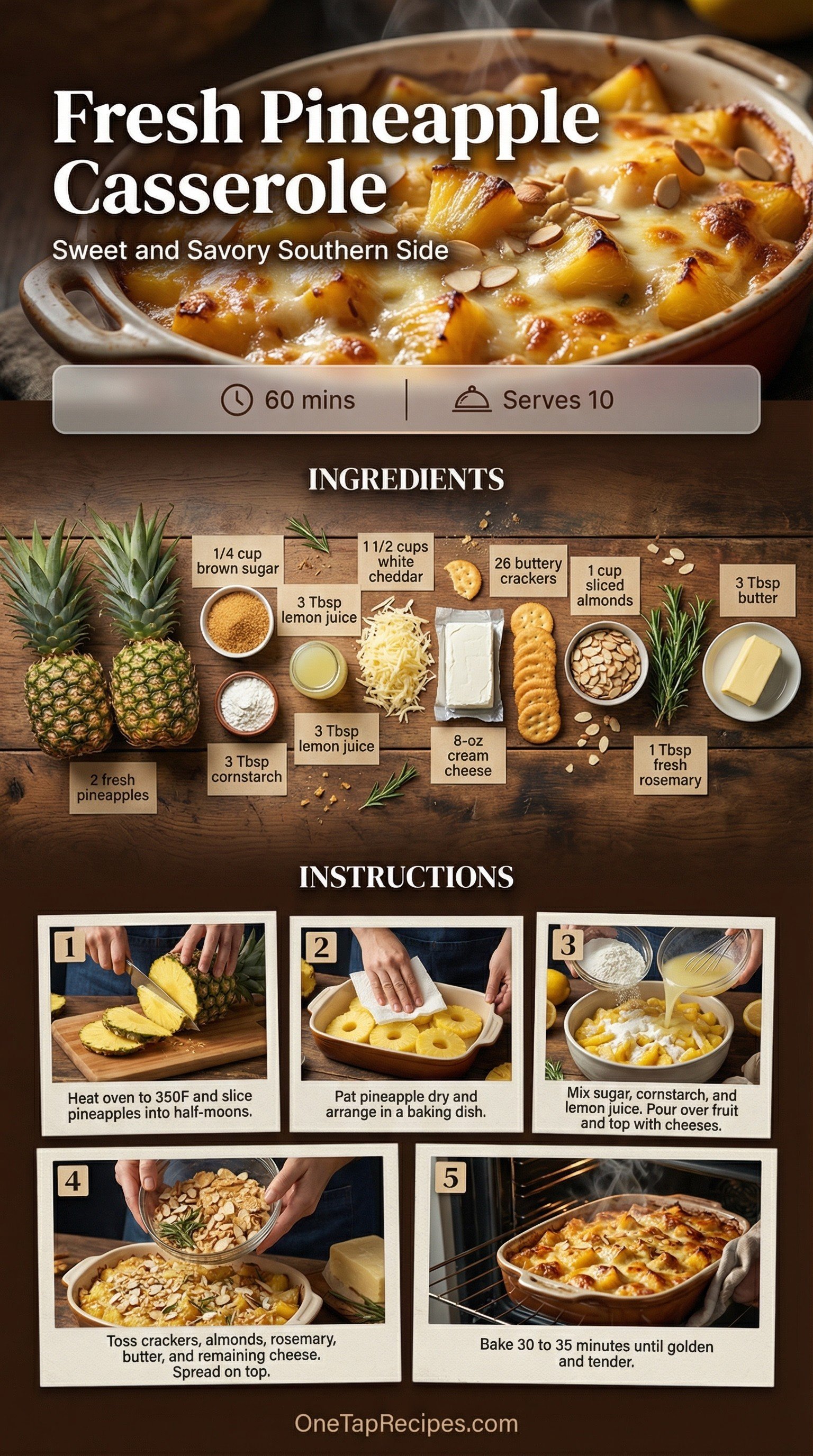 This sweet and savory baked dish combines fresh fruit with a rich cheese topping. It updates the classic Southern side by using fresh pineapple half-moons instead of canned chunks. The fruit is layered with aged white cheddar and cream cheese for a creamy, tangy bite. A topping of buttery crackers, sliced almonds, and fresh rosemary delivers a satisfying crunch. It works beautifully as a surprising side dish for holiday hams or weekend brunches.