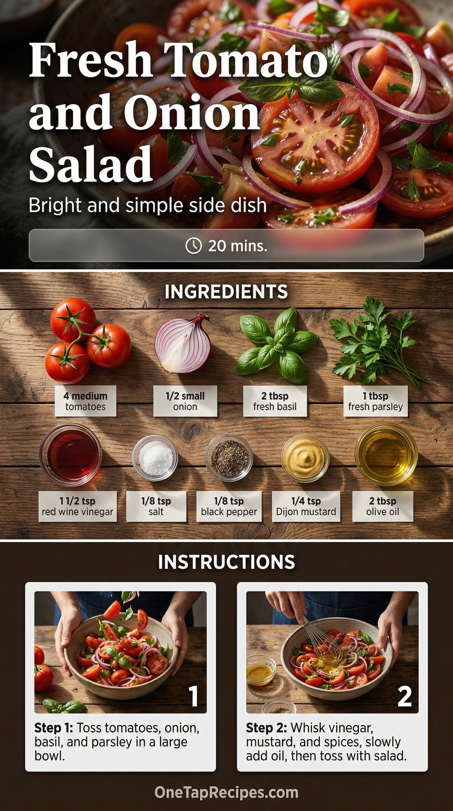 Juicy tomato wedges and crisp raw onions take center stage in this bright, refreshing side dish. A quick homemade vinaigrette of red wine vinegar, Dijon mustard, and olive oil ties everything together with a tangy punch. Fresh basil and parsley bring sweet, aromatic notes that balance the sharp bite of the onion. It's an effortless addition to warm-weather dinners or casual weekend lunches.
