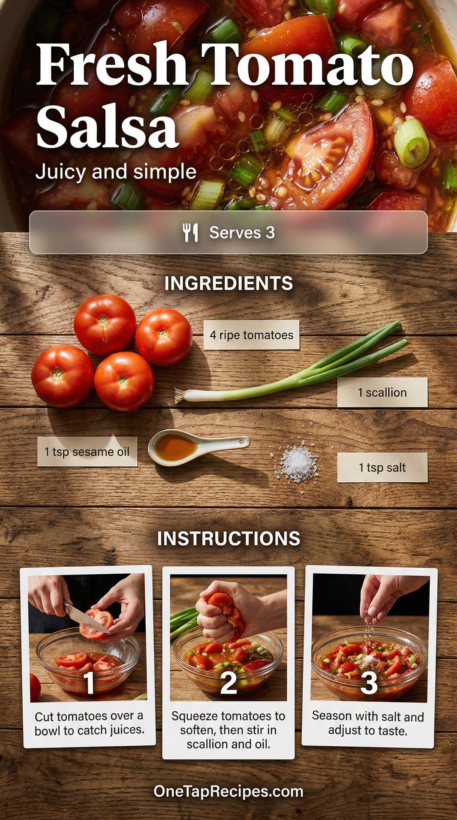 Sweet, peak-season tomatoes take center stage in this incredibly simple condiment. Squeezing the chopped fruit by hand releases all those natural juices, creating a rustic base that doesn't need any cooking. A splash of roasted sesame oil brings an unexpected savory depth that sets it apart from traditional recipes. You'll love spooning this bright mixture over grilled chicken, tossing it with cold noodles, or scooping it up with your favorite chips.