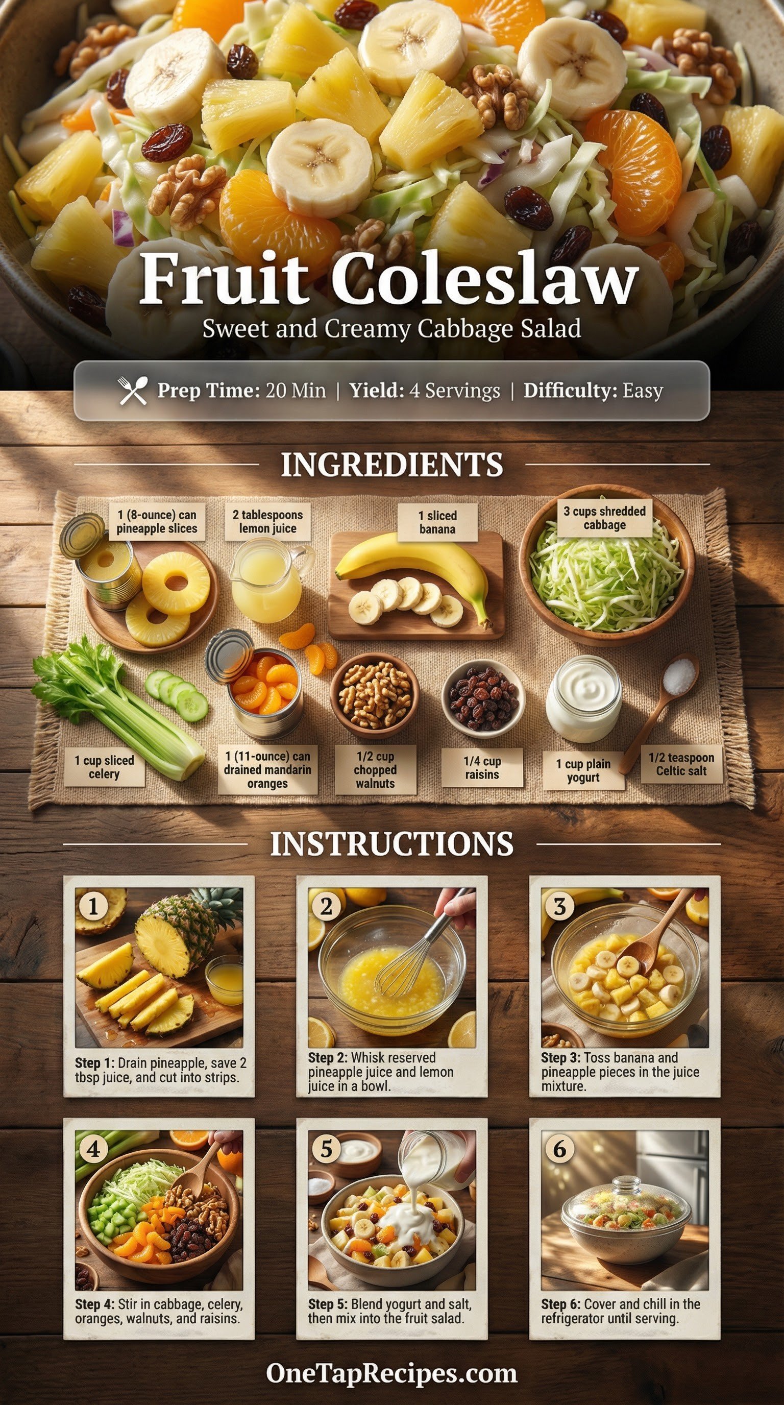 This refreshing fruit coleslaw blends crisp shredded cabbage with a sweet medley of pineapple, mandarin oranges, and sliced bananas. A tangy yogurt and citrus dressing brings the ingredients together, while chopped walnuts and fresh celery add a satisfying crunch to every bite. It makes a bright, creamy side dish for warm weather picnics or a light, fruit-forward lunch option.
