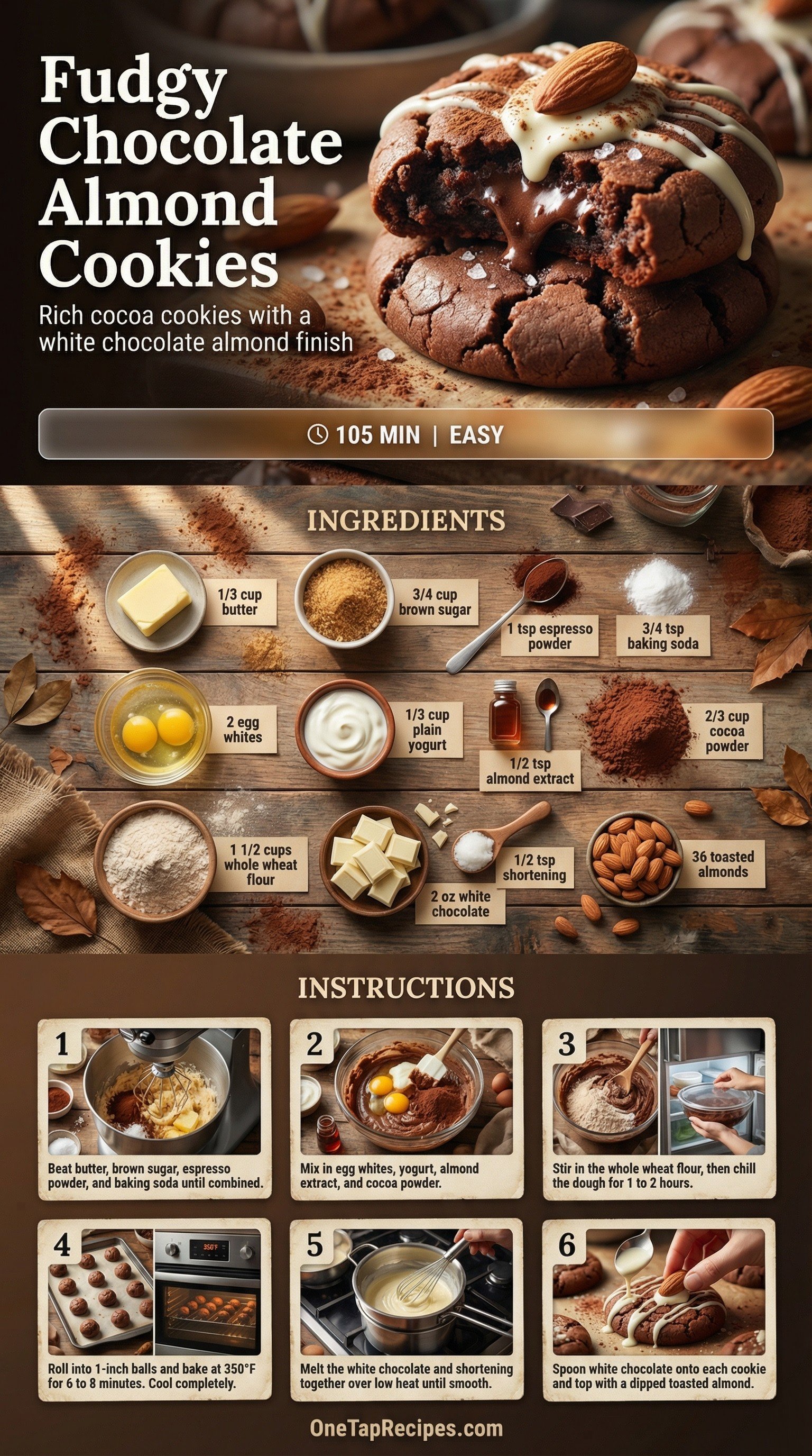 These rich, deeply flavored chocolate cookies are topped with a sweet white chocolate-dipped toasted almond. Using yogurt and egg whites creates a wonderfully soft, fudgy texture, while whole wheat flour adds a slightly nutty backbone. A touch of espresso powder enhances the dark cocoa for a sophisticated flavor profile. They are perfect for an afternoon coffee break or packing into a holiday cookie tin.