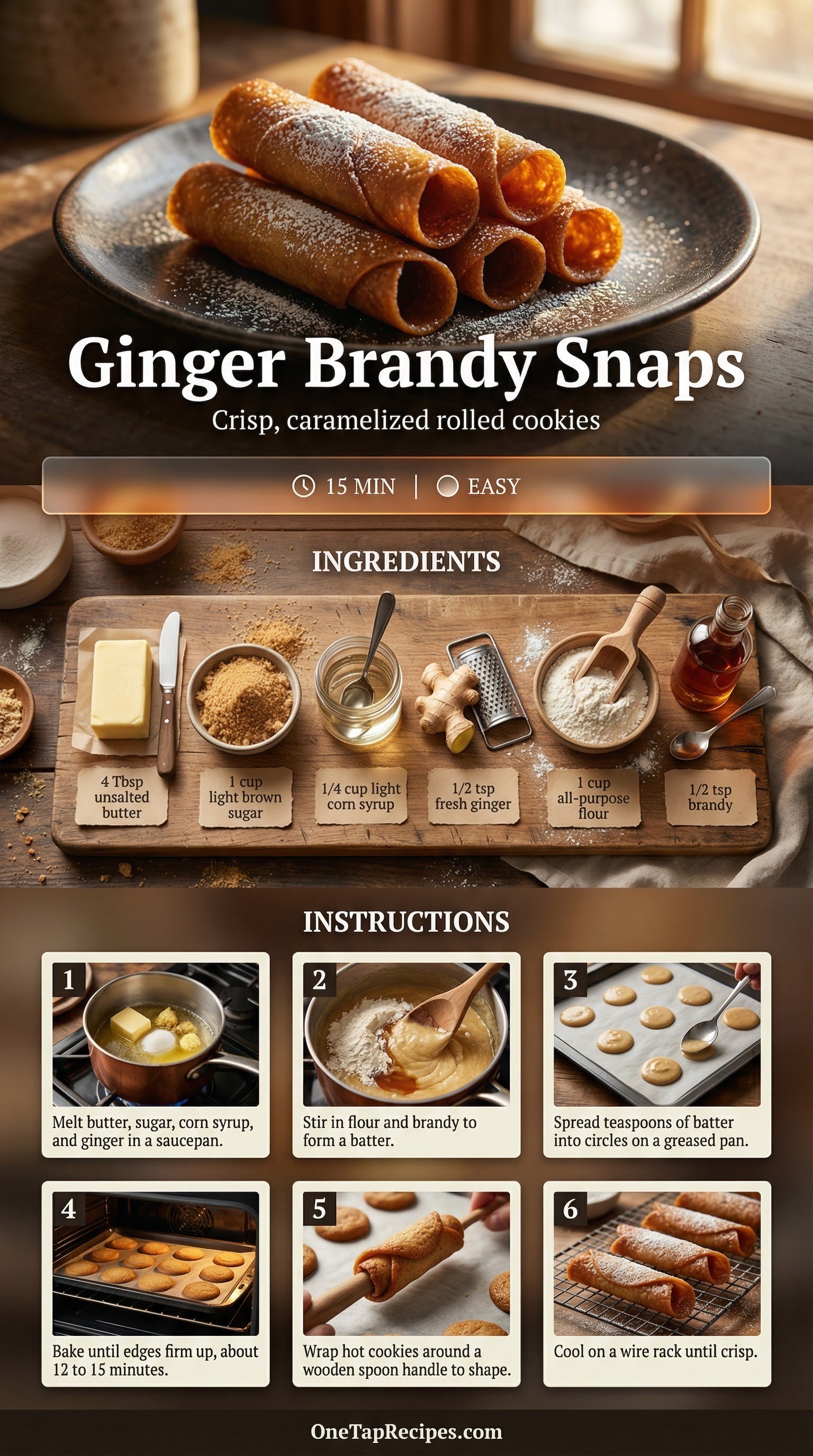 These classic ginger brandy snaps are thin, crisp cookies rolled into delicate cylinders. The batter is cooked briefly on the stove before baking, creating a rich caramel base that hardens into a satisfying crunch. Flavored with fresh ginger and a splash of brandy, they make an elegant addition to holiday dessert platters. Serve them on their own or alongside a cup of hot tea.
