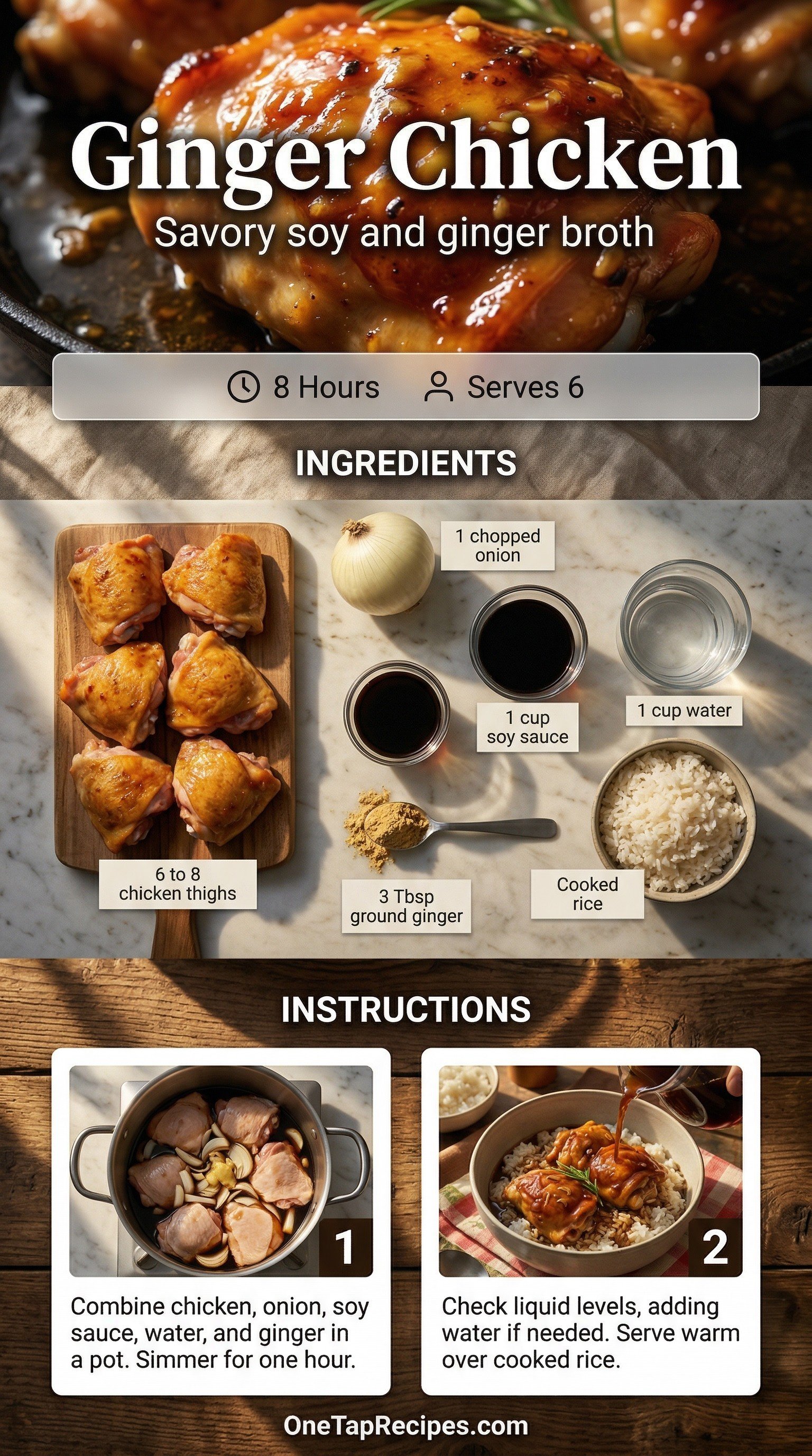 This savory ginger chicken cooks down into a rich, deeply flavored main course. Bone-in chicken thighs simmer gently in a straightforward broth of soy sauce, water, chopped onion, and plenty of ground ginger until fall-apart tender. The slow cooking process creates a comforting sauce that begs to be spooned over a warm bowl of rice. It is an ideal hands-off dinner for busy weeknights.