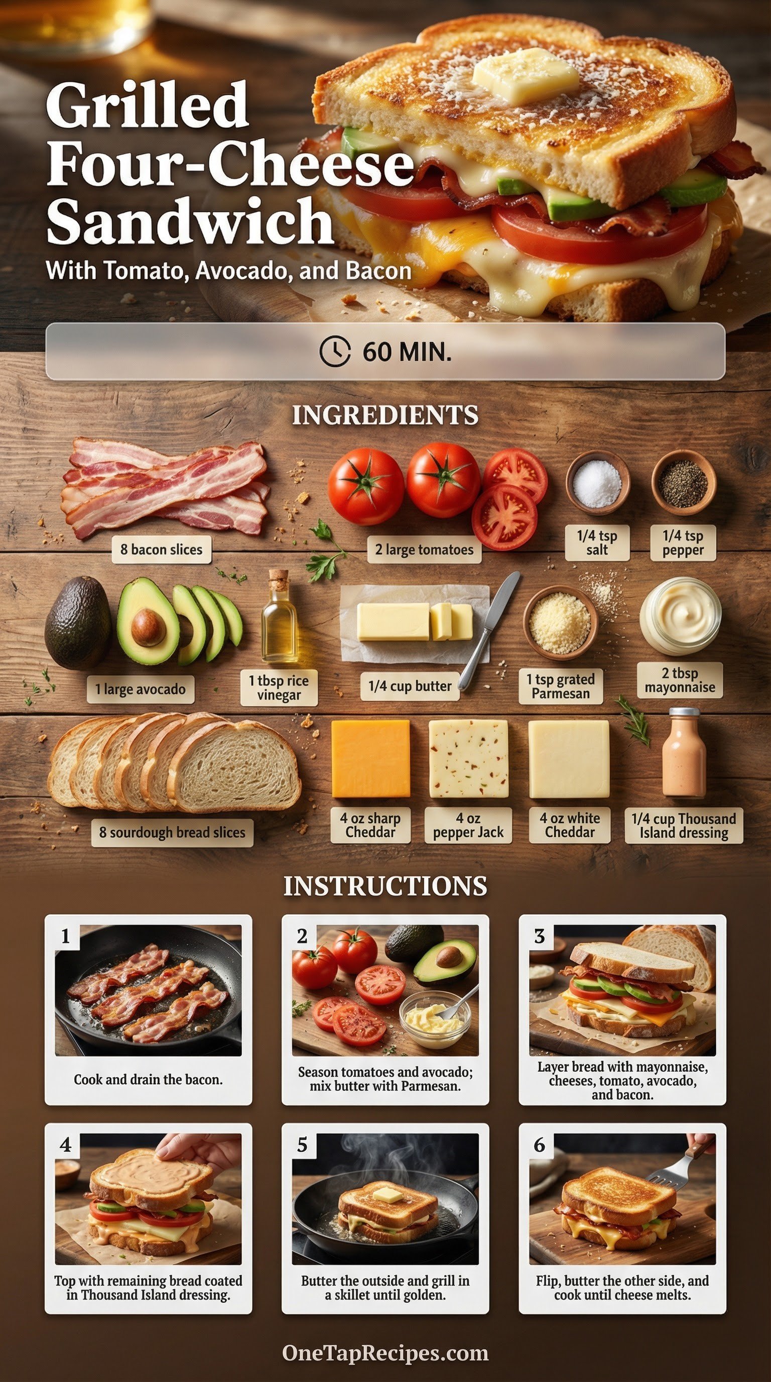 This loaded grilled cheese sandwich packs four types of cheese, fresh vegetables, and crispy bacon between slices of sourdough bread. It combines sharp Cheddar, pepper Jack, white Cheddar, and Parmesan for a deeply savory melt. The rich, gooey cheese contrasts beautifully with the bright acidity of seasoned tomatoes and creamy avocado slices. Serve this hearty sandwich for a comforting weekend lunch or an easy weeknight dinner.