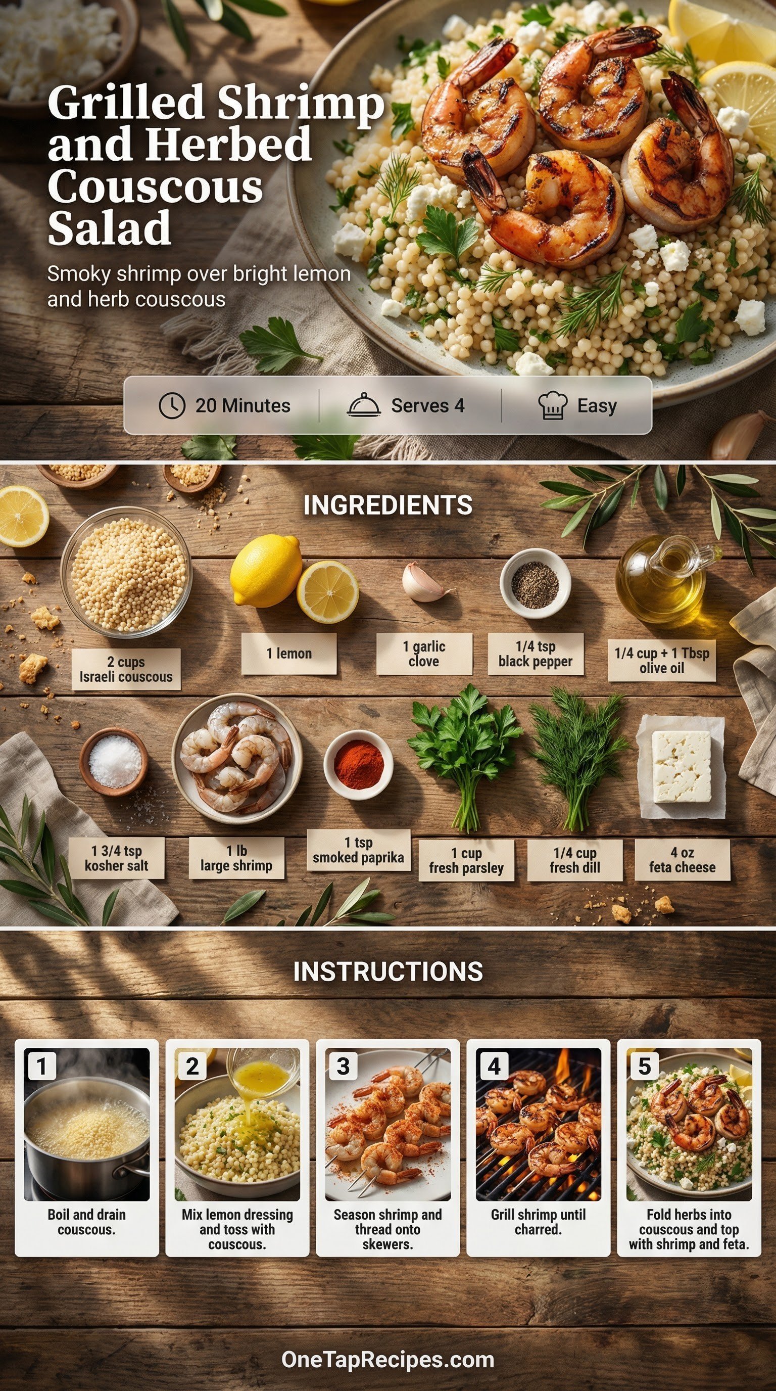 This bright and satisfying salad pairs smoky grilled shrimp with tender Israeli couscous. A quick homemade dressing of fresh lemon juice, garlic, and olive oil brings everything together in minutes. It makes a perfect weeknight dinner or a light weekend lunch when you want something fresh but filling. Plenty of fresh parsley and dill add a clean herbal note, while crumbled feta cheese provides a salty, creamy finish.