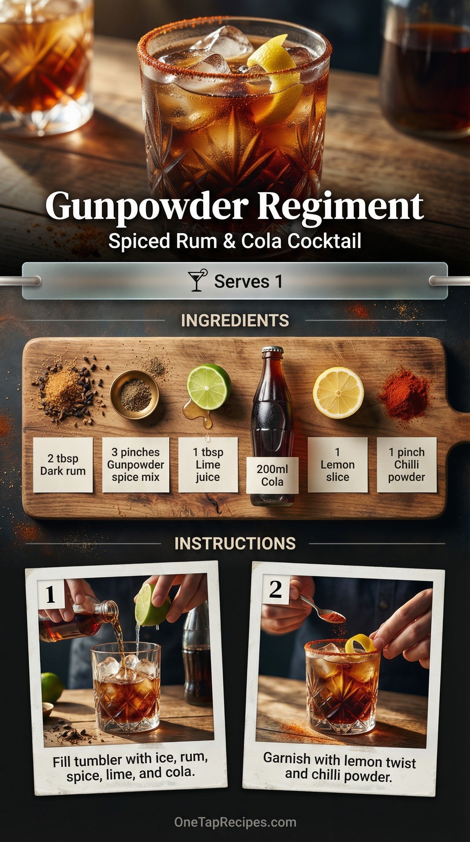 Dark rum meets a savory gunpowder spice mix and fresh lime juice in this bold twist on a classic mixed drink. You'll love how the sharp, aromatic finish of chili powder and a lemon twist balances the sweet cola. It's a complex, refreshing cocktail that elevates your standard drink order into something truly memorable.