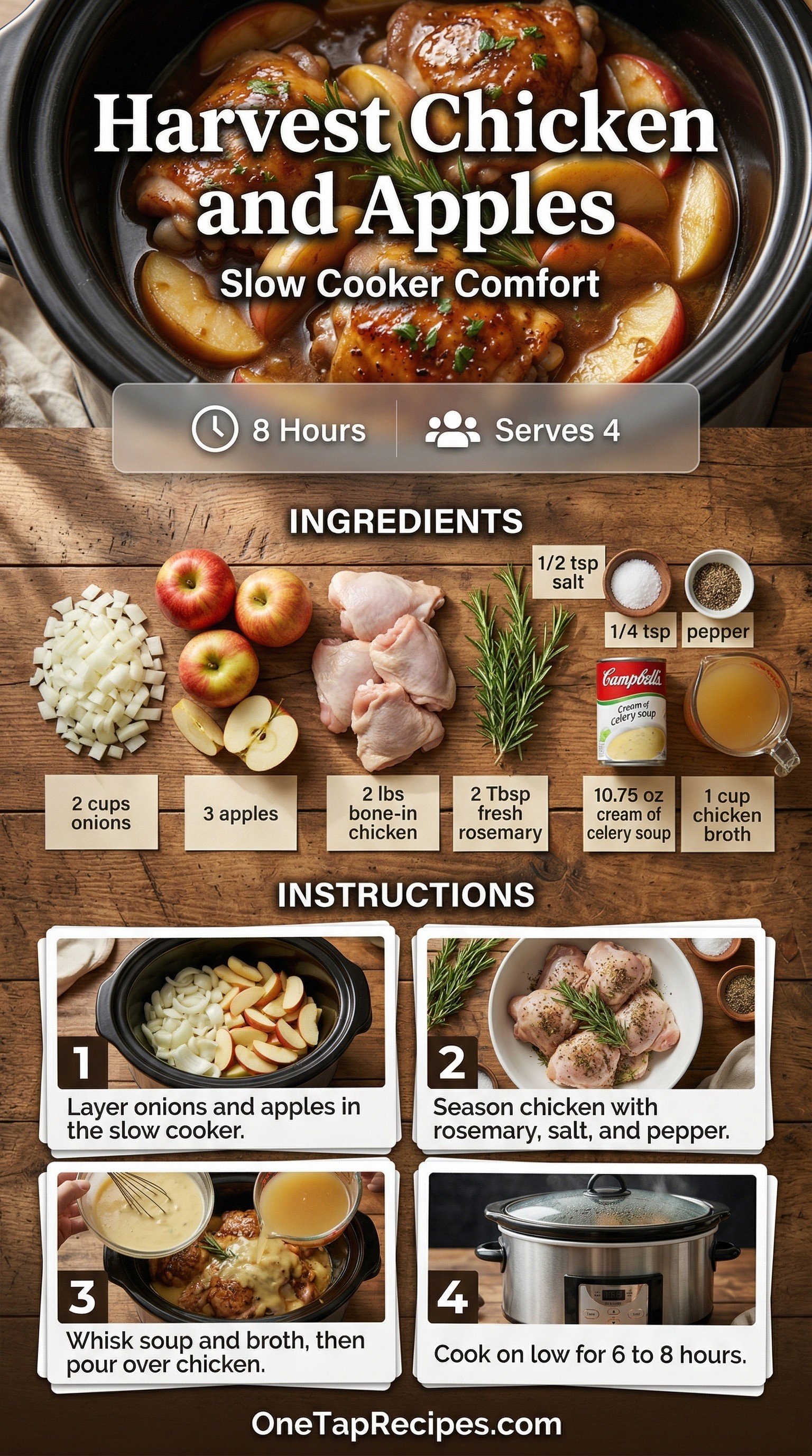 This slow cooker chicken dish pairs tender bone-in pieces with sweet apples and savory onions. Fresh rosemary adds a fragrant, earthy note that balances the rich cream of celery soup and chicken broth base. It is a hands-off meal that fills the kitchen with warm, comforting aromas as it simmers throughout the day. Serve the rich, creamy sauce and tender chicken over a bed of warm rice for a satisfying autumn dinner.