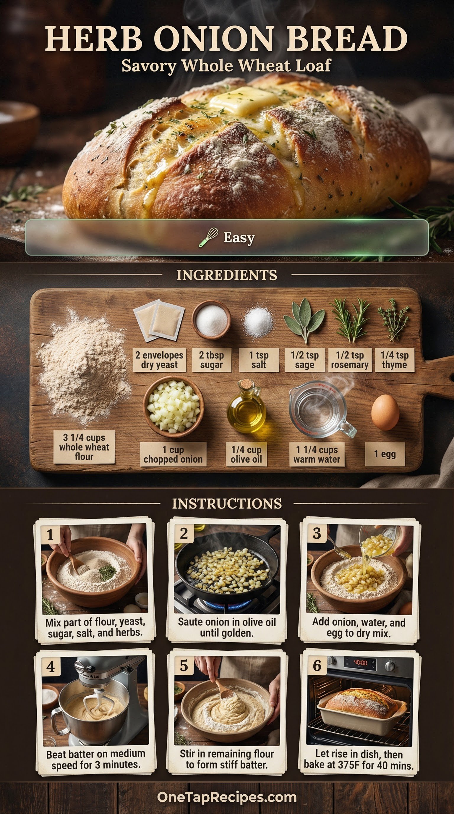 A savory loaf packed with aromatic herbs and sweet sautéed onions. This rustic bread uses whole wheat flour for a hearty texture and deep flavor. Dried sage, rosemary, and thyme blend beautifully with the golden onions to create a fragrant crumb. It is a fantastic companion for soups, stews, or a simple pat of salted butter. The batter-style method means there is no heavy kneading required.