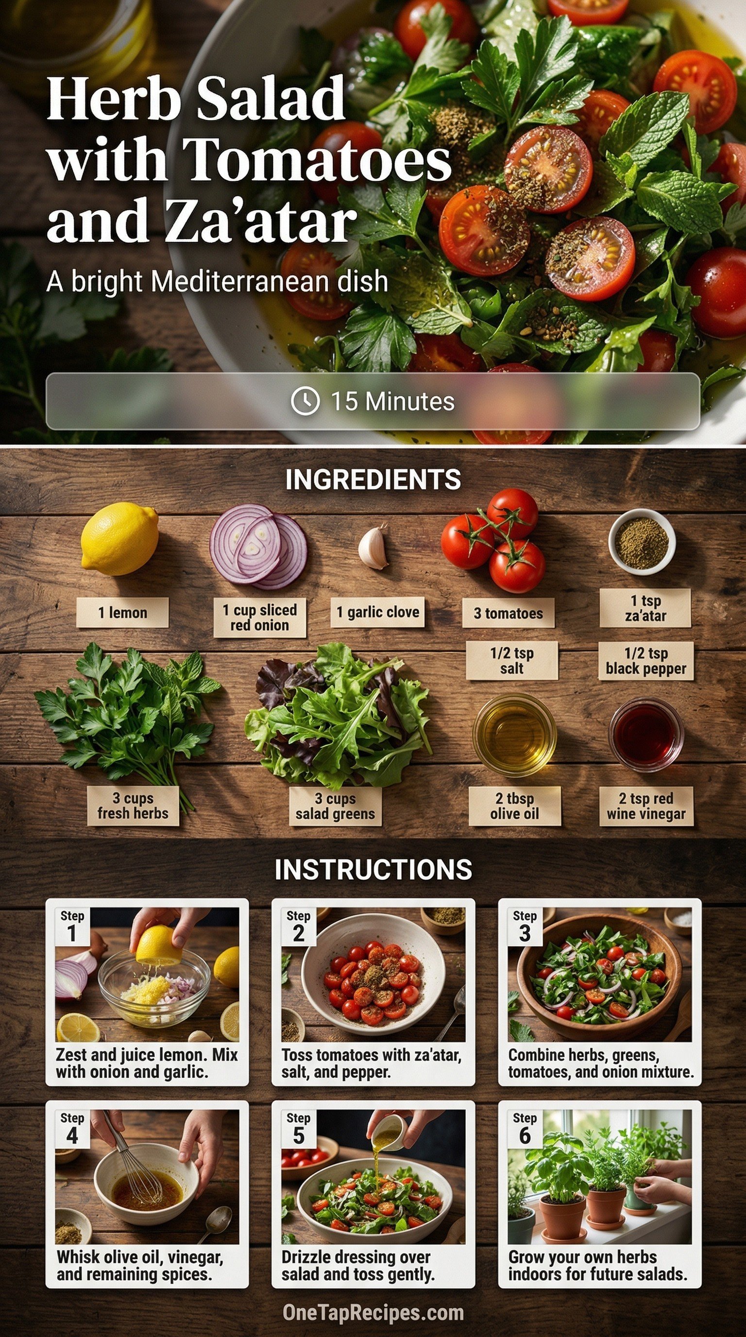 This bright Mediterranean salad treats fresh herbs as the main event rather than a simple garnish. Equal parts leafy greens and aromatic herbs like parsley, basil, and mint create a refreshing base. Sweet summer tomatoes add a juicy contrast to the sharp bite of red onion and garlic. A simple dressing of olive oil, red wine vinegar, and earthy za'atar ties everything together. Serve this quick dish alongside grilled chicken or as a light lunch on a warm afternoon.