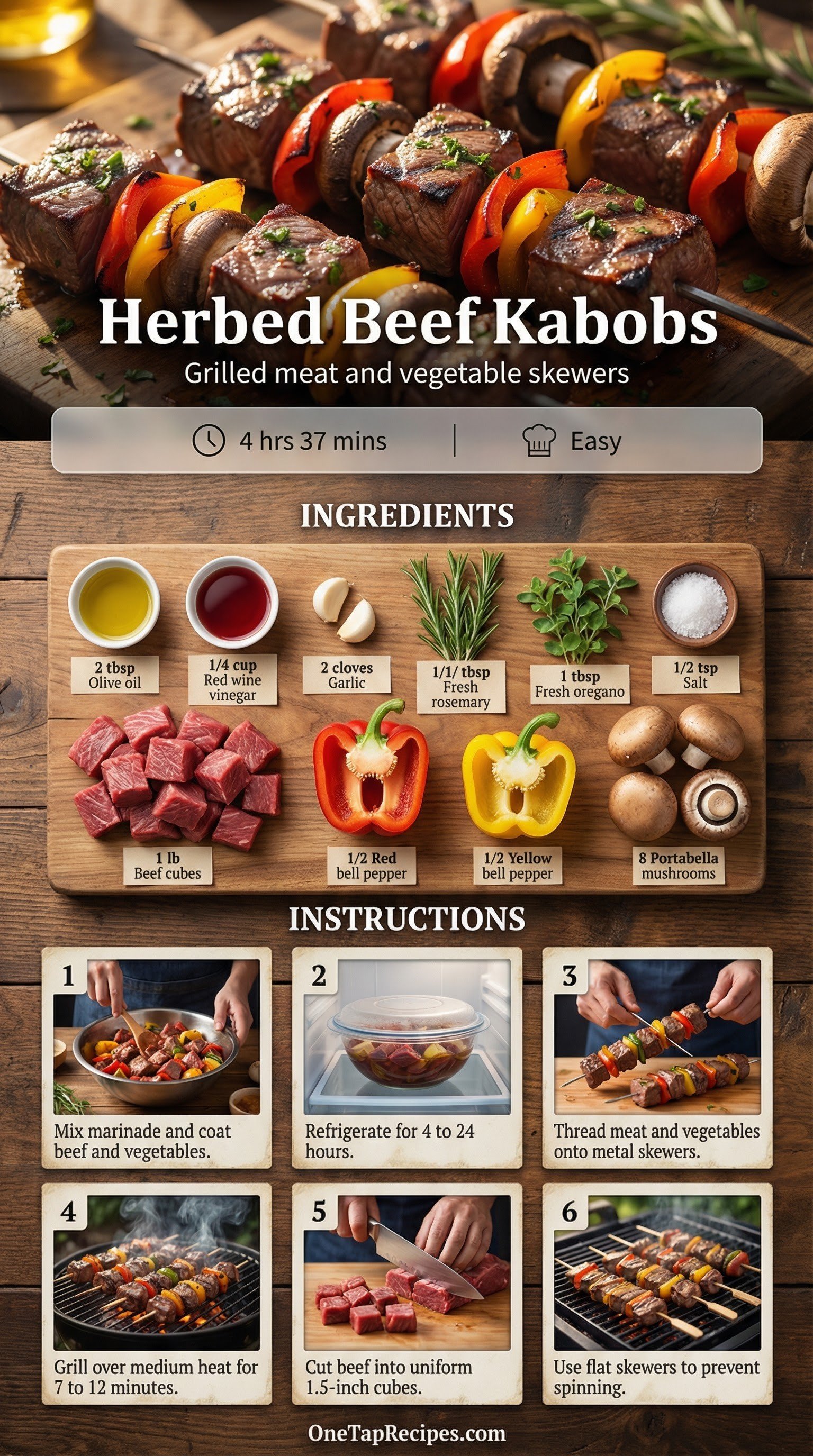 Tender beef cubes, bell peppers, and portabella mushrooms are marinated in a bright herb vinaigrette and grilled on skewers. The red wine vinegar and fresh rosemary marinade tenderizes the meat while adding robust flavor. These kabobs are a classic choice for a weekend cookout or relaxed outdoor dinner. The result is smoky, savory, and juicy.
