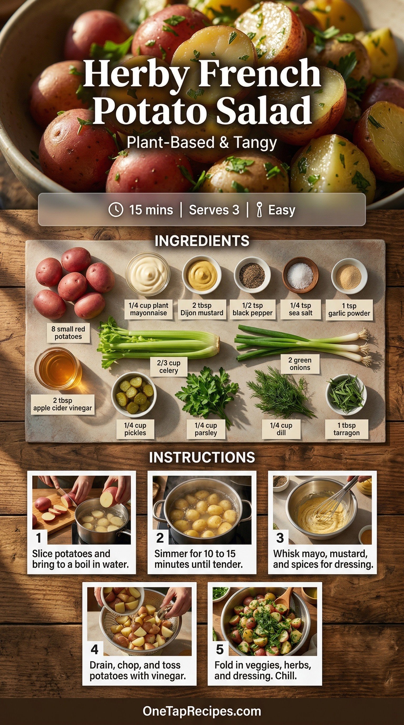 This plant-based French potato salad is a bright, herbaceous take on a classic side dish. It skips heavy traditional dressings in favor of a tangy mix of plant mayonnaise, Dijon mustard, and apple cider vinegar. Fresh parsley, dill, and tarragon bring crisp green flavor to every bite, while celery and pickles add a satisfying crunch. Serve this refreshing salad at your next summer picnic or as a quick weeknight side.