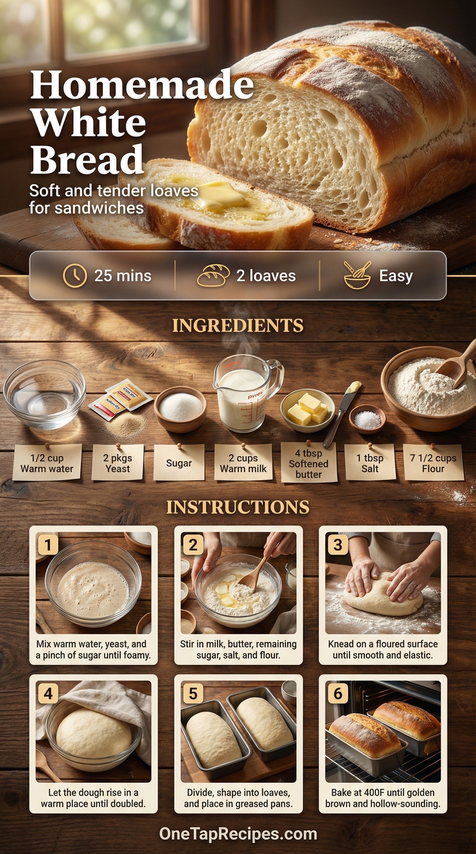 Bake a beautiful, tall loaf of homemade white bread right in your own kitchen. This reliable staple yields a soft, tender crumb and a golden crust that holds up well for sandwiches or morning toast. Warm milk and softened butter enrich the dough, giving the finished bread a comforting, nostalgic flavor. The process of kneading and shaping the dough brings a wonderful aroma to the house. Serve thick slices warm from the oven with a generous smear of butter and fruit preserves.