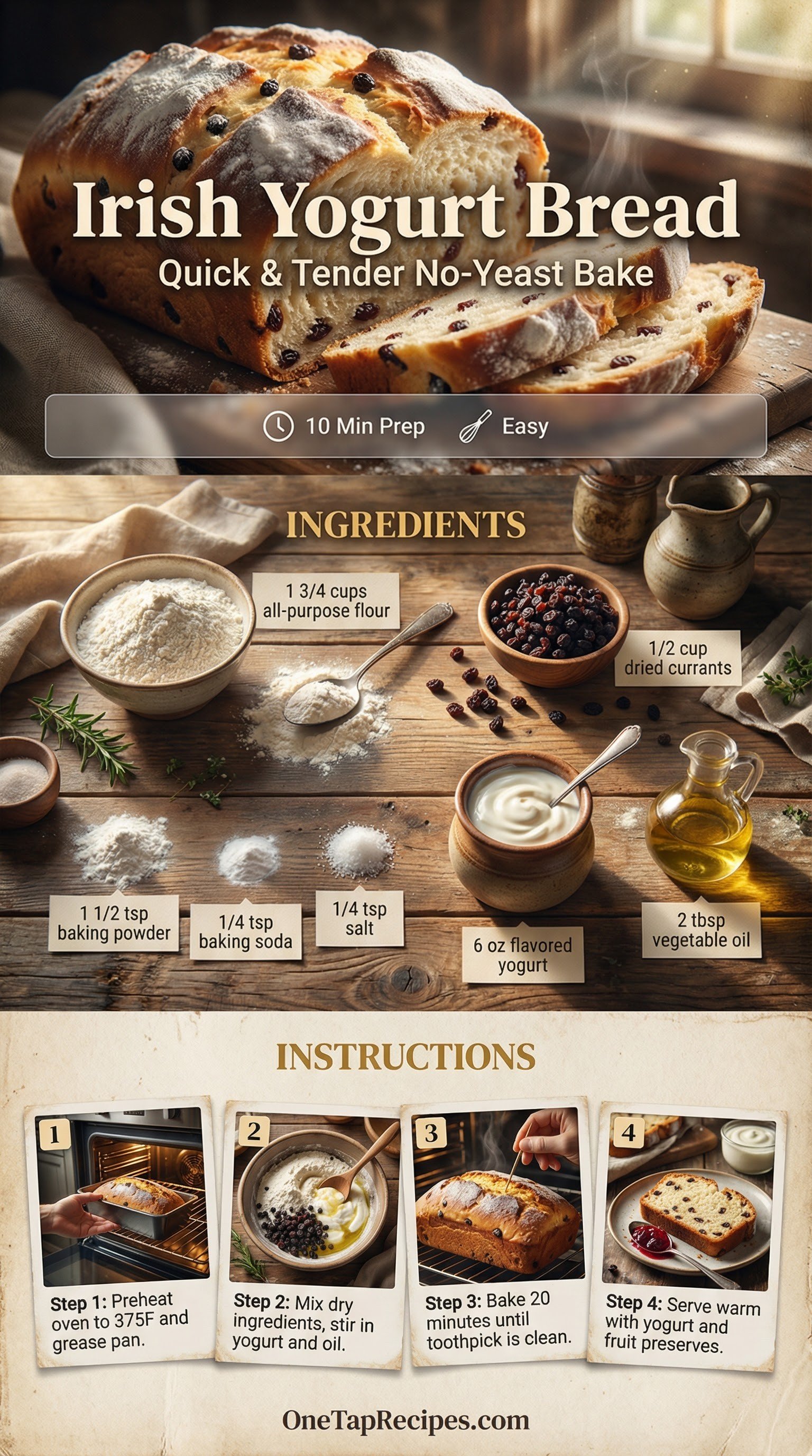 This quick Irish yogurt bread is a simple, no-yeast bake that comes together in minutes. Flavored yogurt provides moisture and a subtle tang, while dried currants add sweet, chewy bites throughout the tender crumb. Because it skips the long rising times of traditional bread, you can have a warm loaf ready for breakfast or an afternoon snack almost immediately. Serve it fresh from the oven with a quick drizzle of yogurt and fruit preserves for a perfect sweet finish.