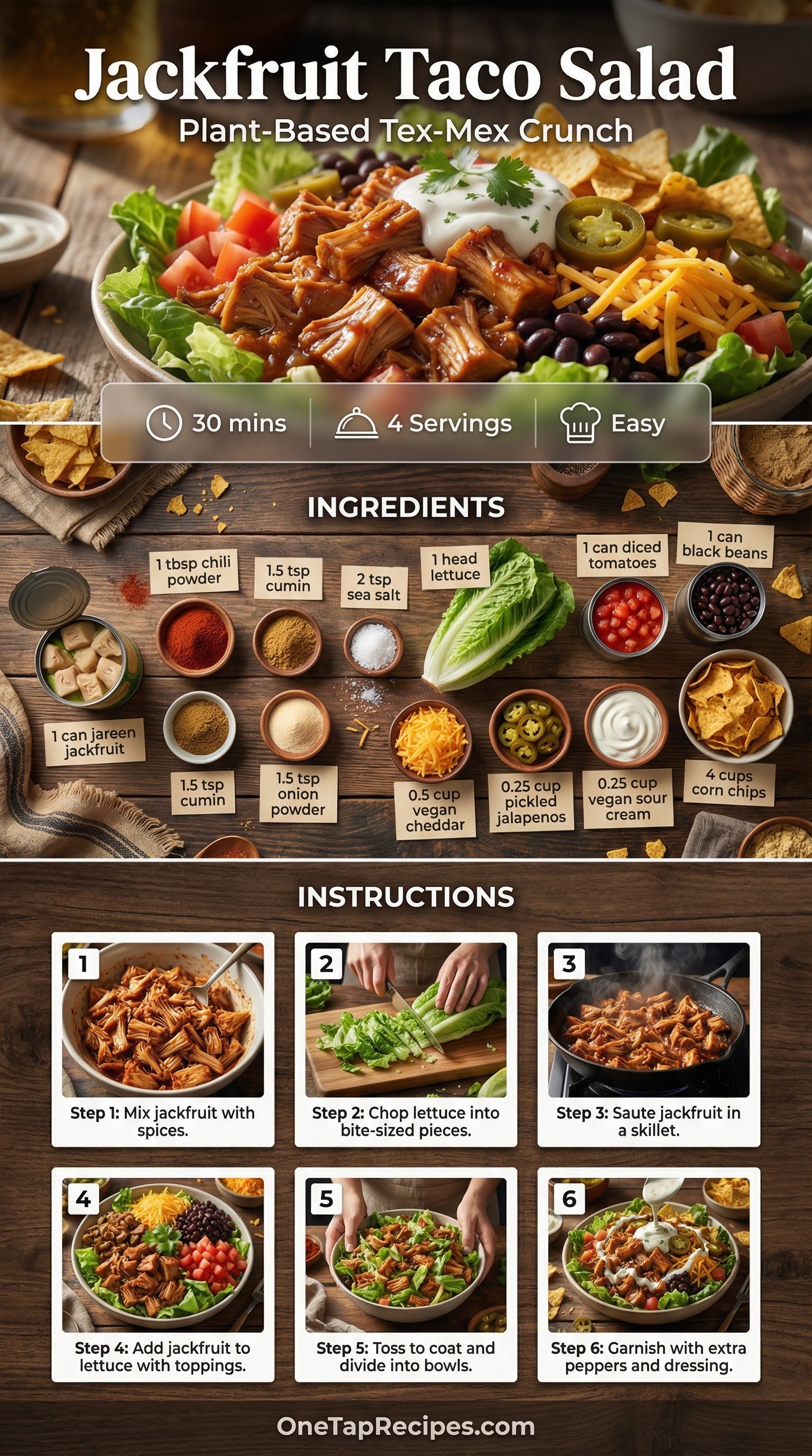 This plant-based take on a classic Tex-Mex favorite transforms canned jackfruit into a hearty, spiced taco filling. The jackfruit is seasoned with chili powder, cumin, and onion powder before being pan-fried to a light brown finish. Tossed with crisp iceberg lettuce, black beans, diced tomatoes, and vegan cheddar, this salad delivers all the satisfying crunch of a traditional taco. A handful of crushed corn chips and a dollop of vegan sour cream complete the bowl. It is a quick and flavorful option for busy weeknights when you crave something fresh but filling.