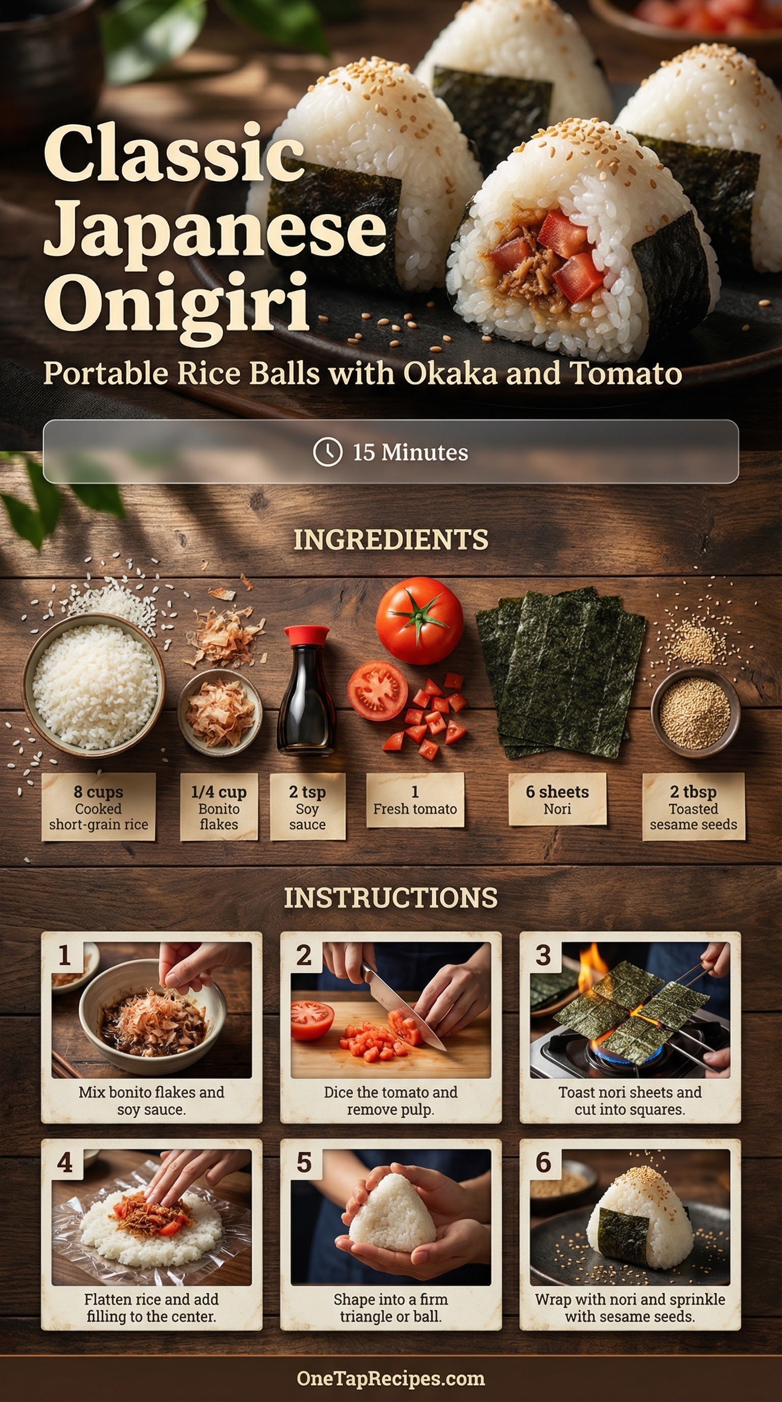 Soft, sticky short-grain rice gives way to a savory, salty center in these classic Japanese rice balls. You'll wrap them in crisp nori for a portable bite that's deeply satisfying. This version features two distinct fillings, pairing soy-seasoned bonito flakes with fresh tomatoes. They're a brilliant way to use up leftover cooked rice and pack beautifully for your midday meal.