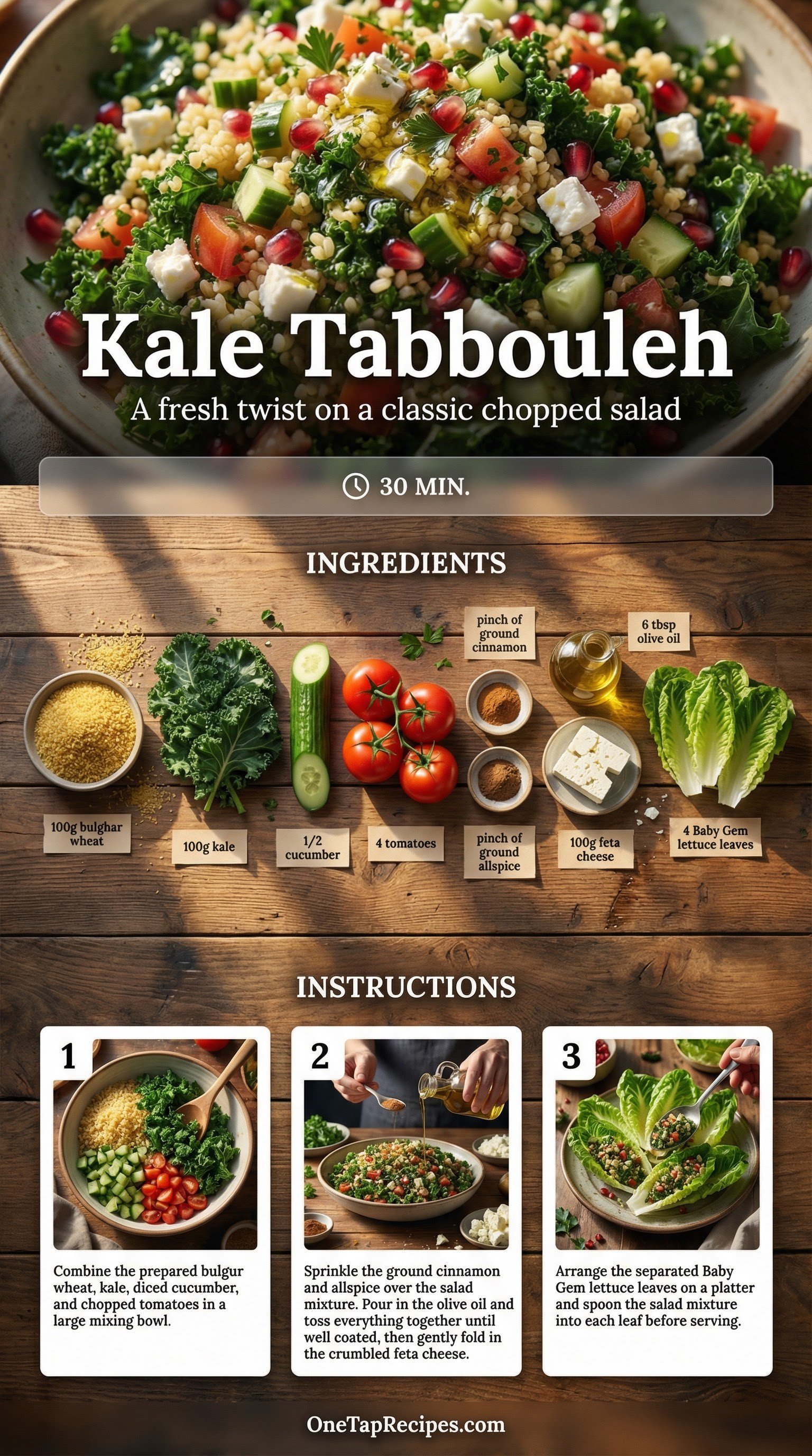 A fresh twist on the classic Middle Eastern chopped salad, swapping traditional herbs for hearty kale. It combines tender bulgur wheat with crisp cucumbers, juicy tomatoes, and a warm pinch of cinnamon and allspice. Perfect for a light lunch or a refreshing side dish at your next dinner gathering. Crumbled feta adds a creamy, salty bite that balances the earthy greens and crisp vegetables.