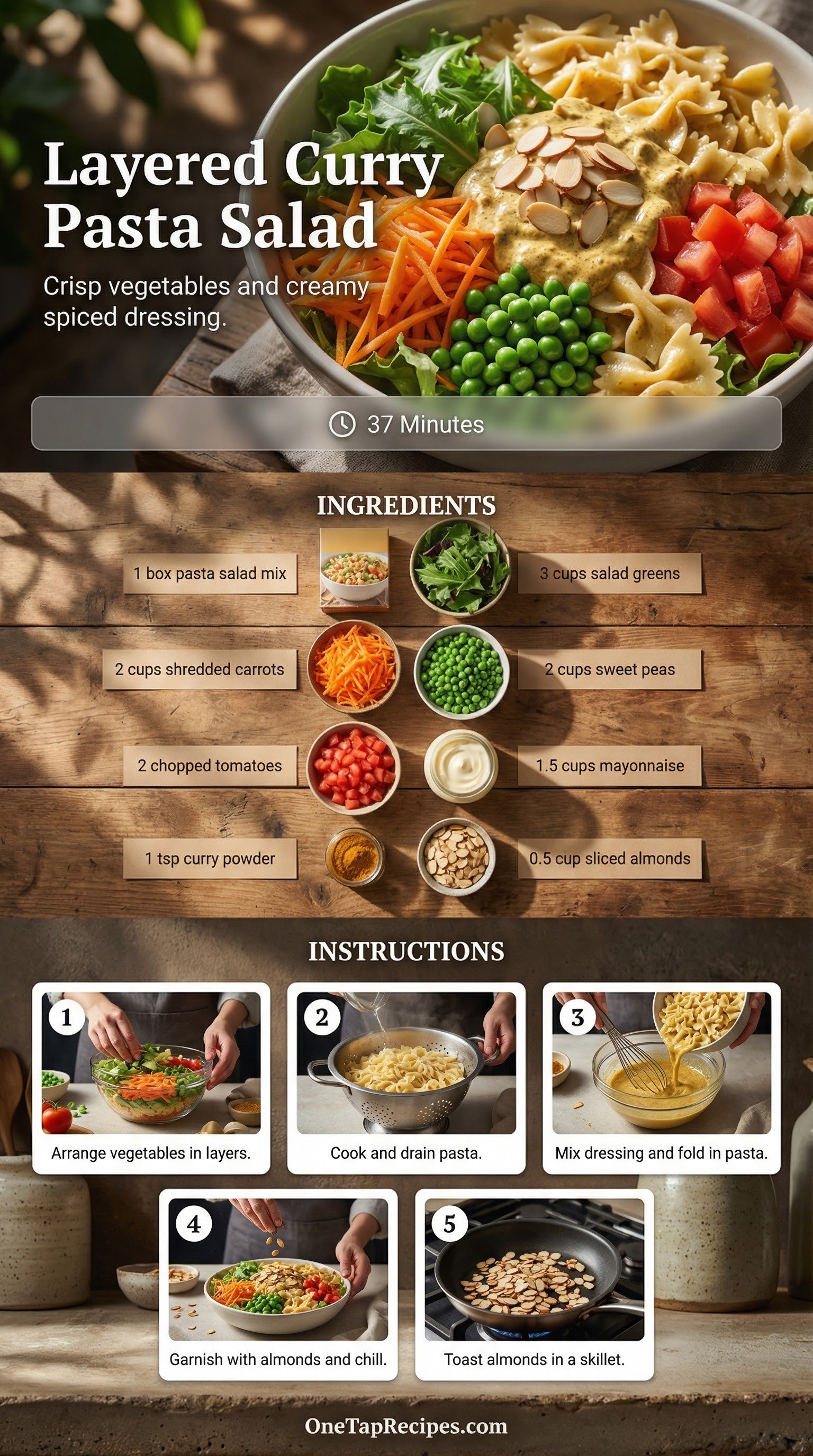 This colorful layered pasta salad combines crisp vegetables with a creamy, spiced dressing for a refreshing side dish. It uses a convenient boxed pasta mix as a base, brightened with a touch of curry powder and fresh produce. The crisp greens, sweet peas, and juicy tomatoes provide a satisfying crunch that pairs perfectly with the rich dressing. Toasted almonds add a final layer of nutty flavor and texture. It is a great choice for potlucks, picnics, or a quick weeknight meal.