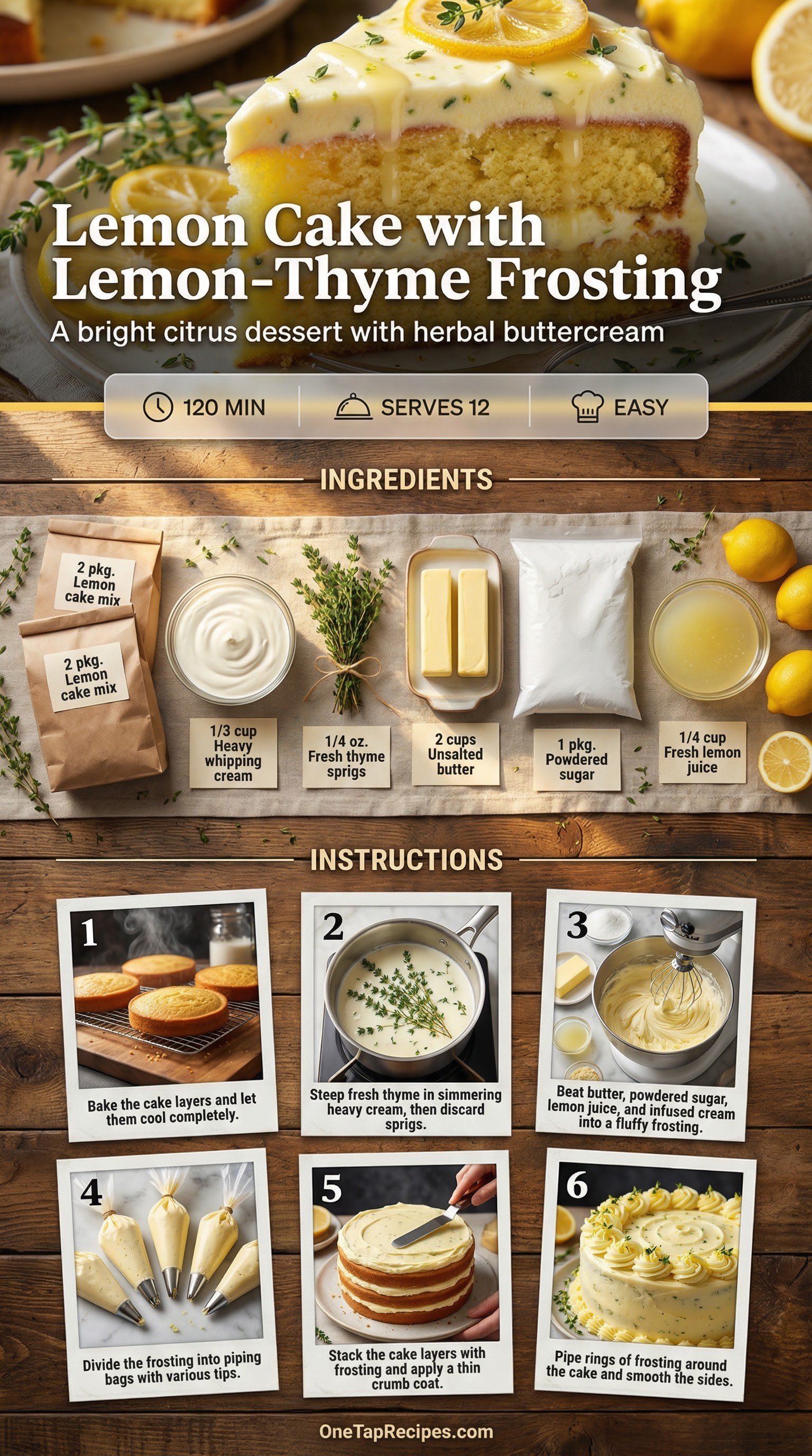 A bright citrus dessert pairs fluffy cake layers with a uniquely herbal buttercream. Steeping fresh thyme in heavy cream creates a fragrant, savory base for the rich and sweet frosting. Using boxed cake mix keeps the preparation straightforward while delivering reliable, tender results every time. It is an elegant centerpiece for spring gatherings, afternoon tea, or weekend celebrations.