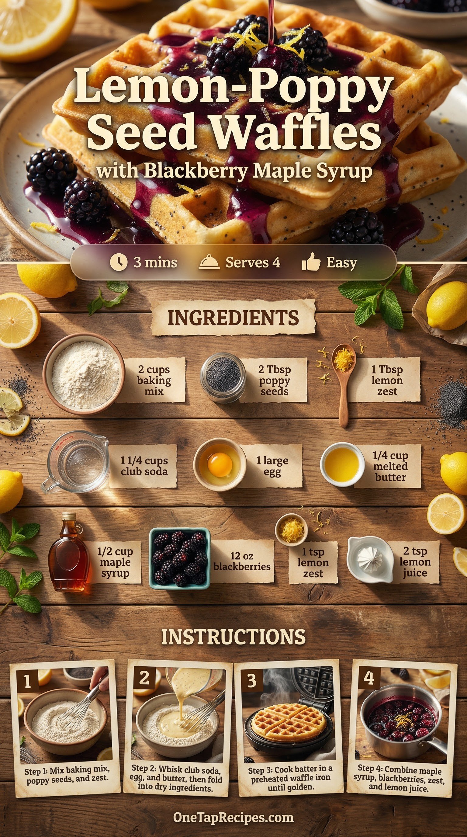 Crispy on the outside and impossibly light inside, these golden waffles get their airy texture from a splash of club soda. You'll love how the bright lemon zest and crunchy poppy seeds cut through the richness of the melted butter. Instead of standard maple syrup, they're crowned with a quick, fruity topping made from thawed blackberries. It's a comforting breakfast that feels fancy but relies on a simple baking mix to keep your morning stress-free.