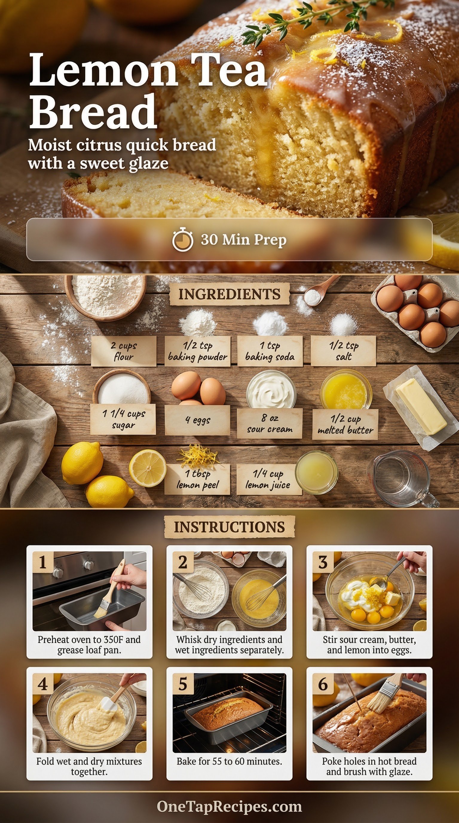 Lemon tea bread is a bright, citrus-forward quick bread baked in a classic loaf pan. The batter relies on a rich blend of melted butter and sour cream to create a remarkably moist crumb that stays tender for days. Freshly grated lemon peel and juice bring a sharp, sunny flavor to every slice. A simple sweet lemon glaze gets brushed over the hot loaf right out of the oven, soaking into the top for an extra layer of tartness. Serve a thick slice alongside your morning coffee or as an afternoon snack.
