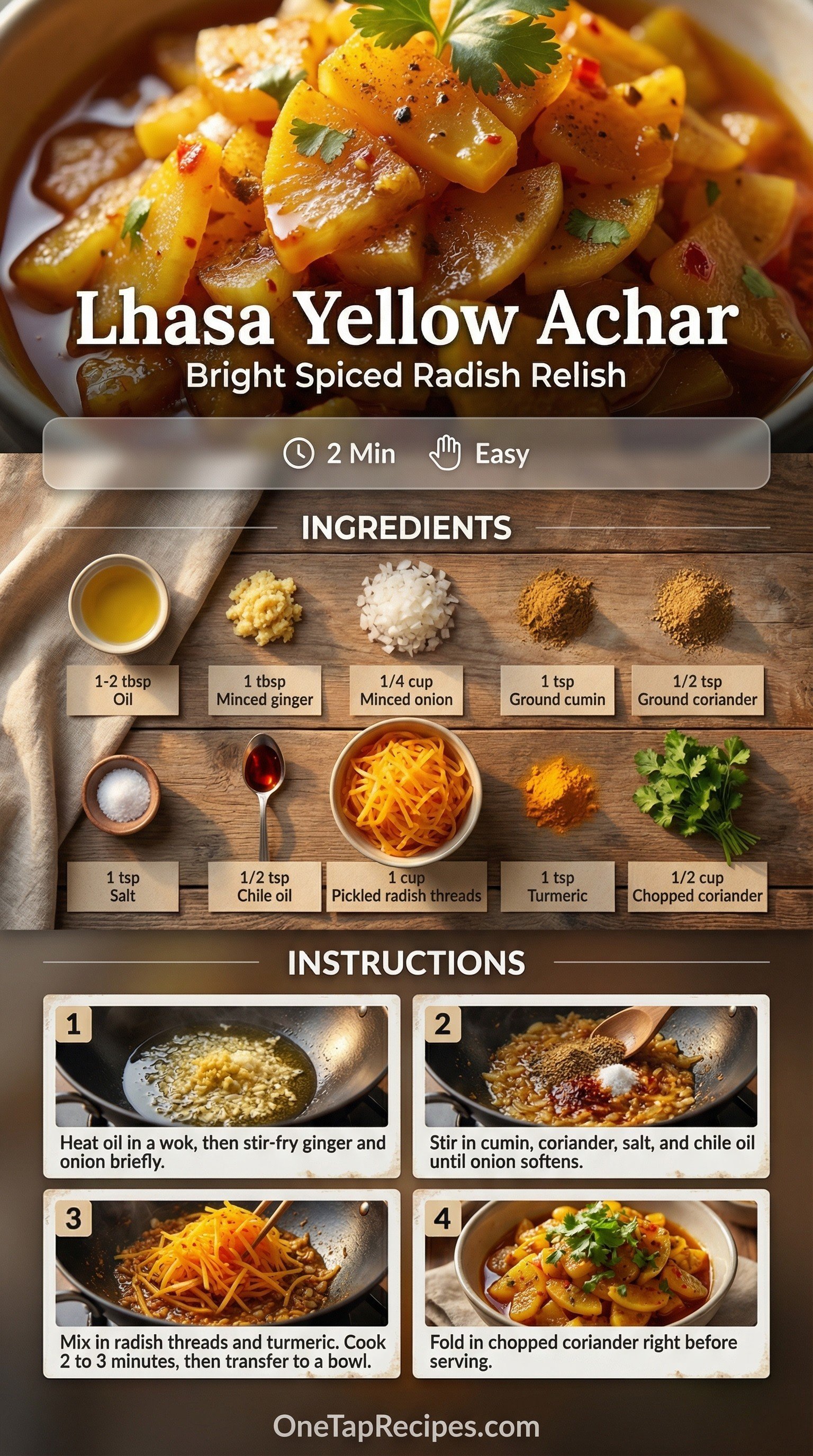 This bright yellow achar is a quick, deeply savory radish relish that brings a sharp pop of flavor to any meal. Rooted in Nepalese and Tibetan culinary traditions, it combines pickled radish threads with warm spices like cumin, coriander, and earthy turmeric. A touch of ginger and chile oil adds a tingling heat that balances the sharp crunch of the radish. Serve this quick condiment alongside rice bowls, roasted meats, or simple curries to instantly elevate your dinner.