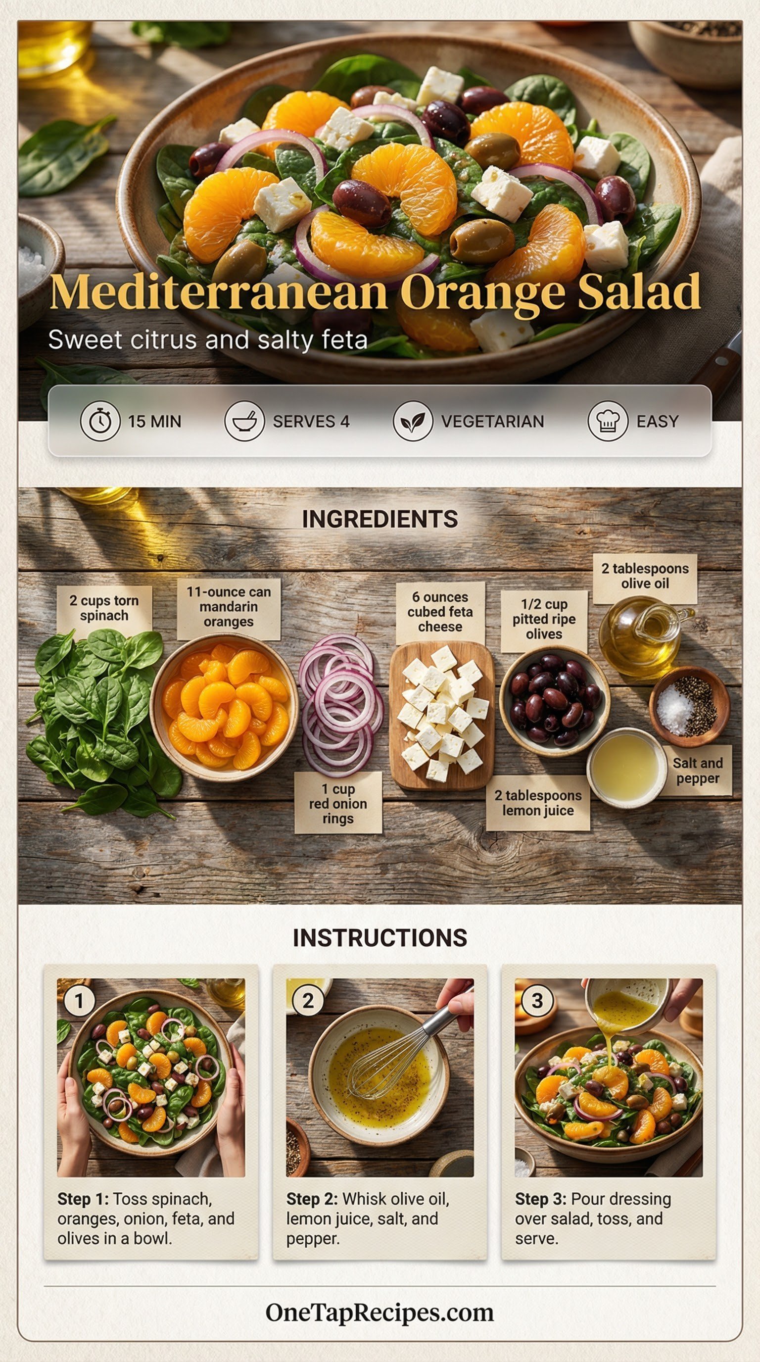 A bright and refreshing salad brings together sweet mandarin oranges and salty feta cheese over a bed of fresh spinach. The combination of juicy citrus and briny black olives creates a bold flavor profile inspired by coastal cooking. Crisp red onion rings add a sharp bite that balances the rich cheese. A simple dressing of extra virgin olive oil and fresh lemon juice ties everything together with a light, acidic finish. Serve it as a quick lunch or a colorful side dish for grilled chicken or fish.