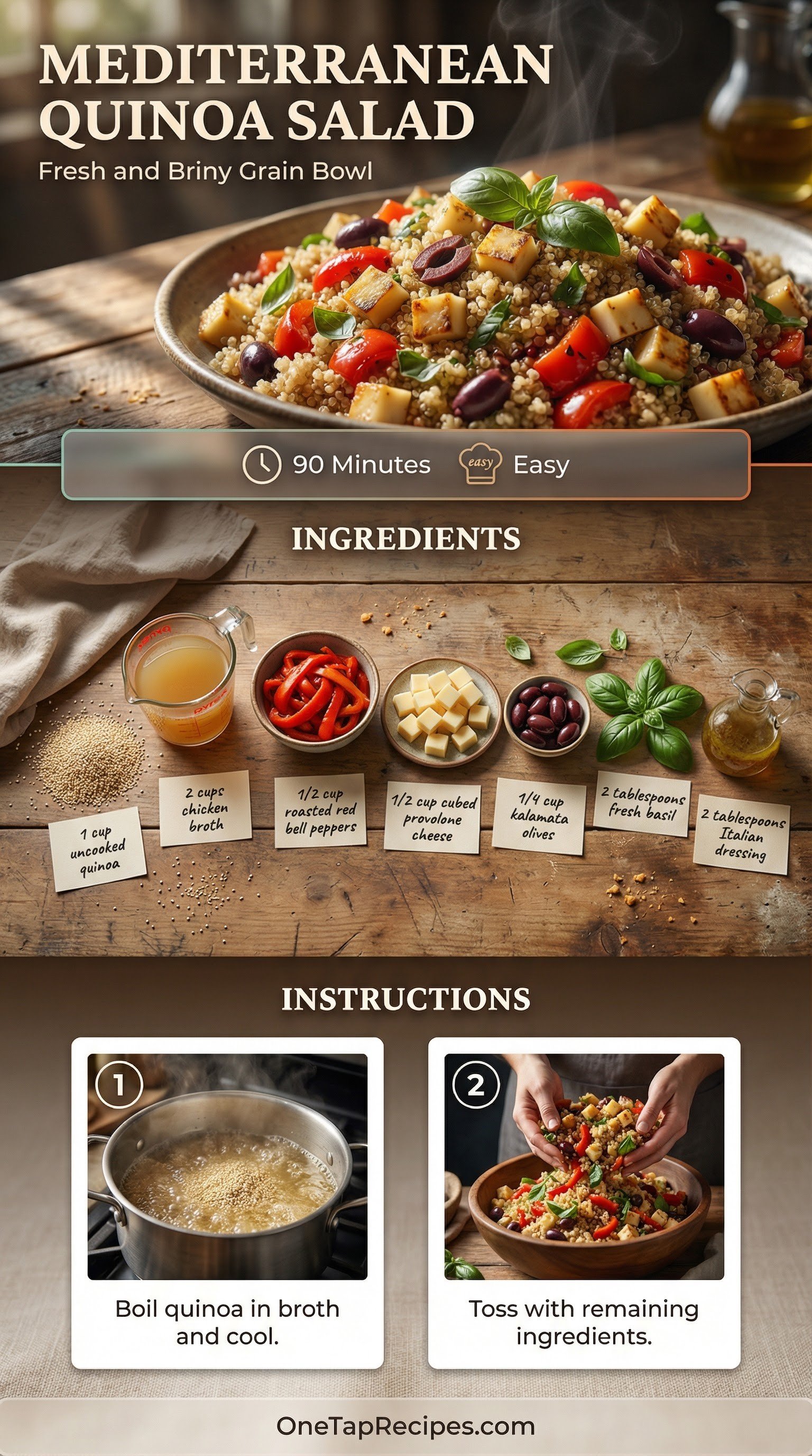 This Mediterranean quinoa salad combines tender grains with roasted red peppers, kalamata olives, and cubed provolone cheese. Cooking the quinoa in chicken broth adds a deep savory base note to the bright, briny mix-ins. Fresh basil and a simple Italian dressing tie everything together with minimal effort. It works perfectly as a light lunch or a make-ahead side dish for weeknight dinners.
