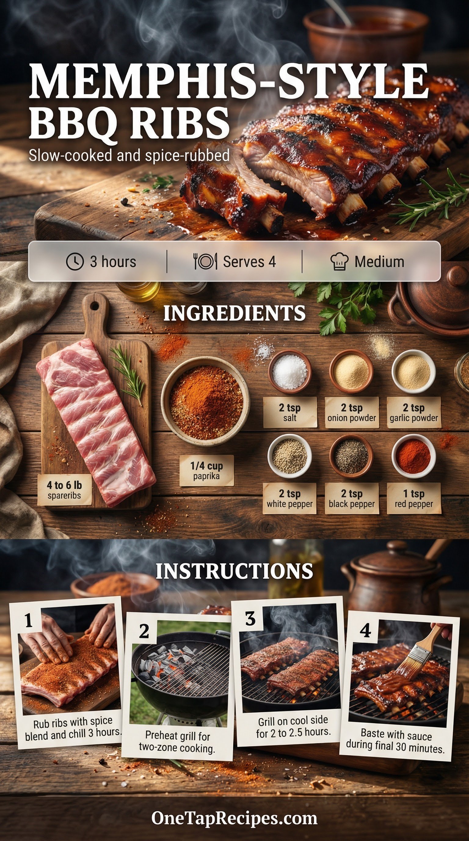 These classic pork ribs are cooked low and slow on the grill for incredibly tender meat. A robust dry rub made with paprika, garlic, onion, and three types of pepper builds a deep, spicy crust. They are perfect for weekend cookouts and casual outdoor entertaining. The ribs finish with a sticky barbecue sauce glaze that balances the smoky heat of the rub.